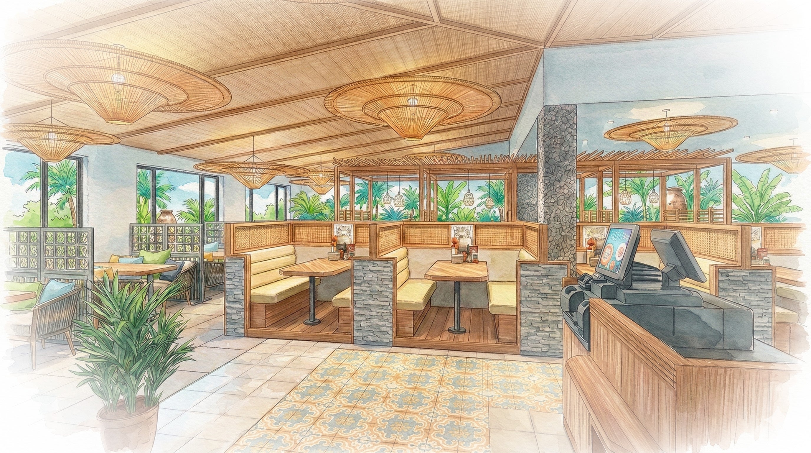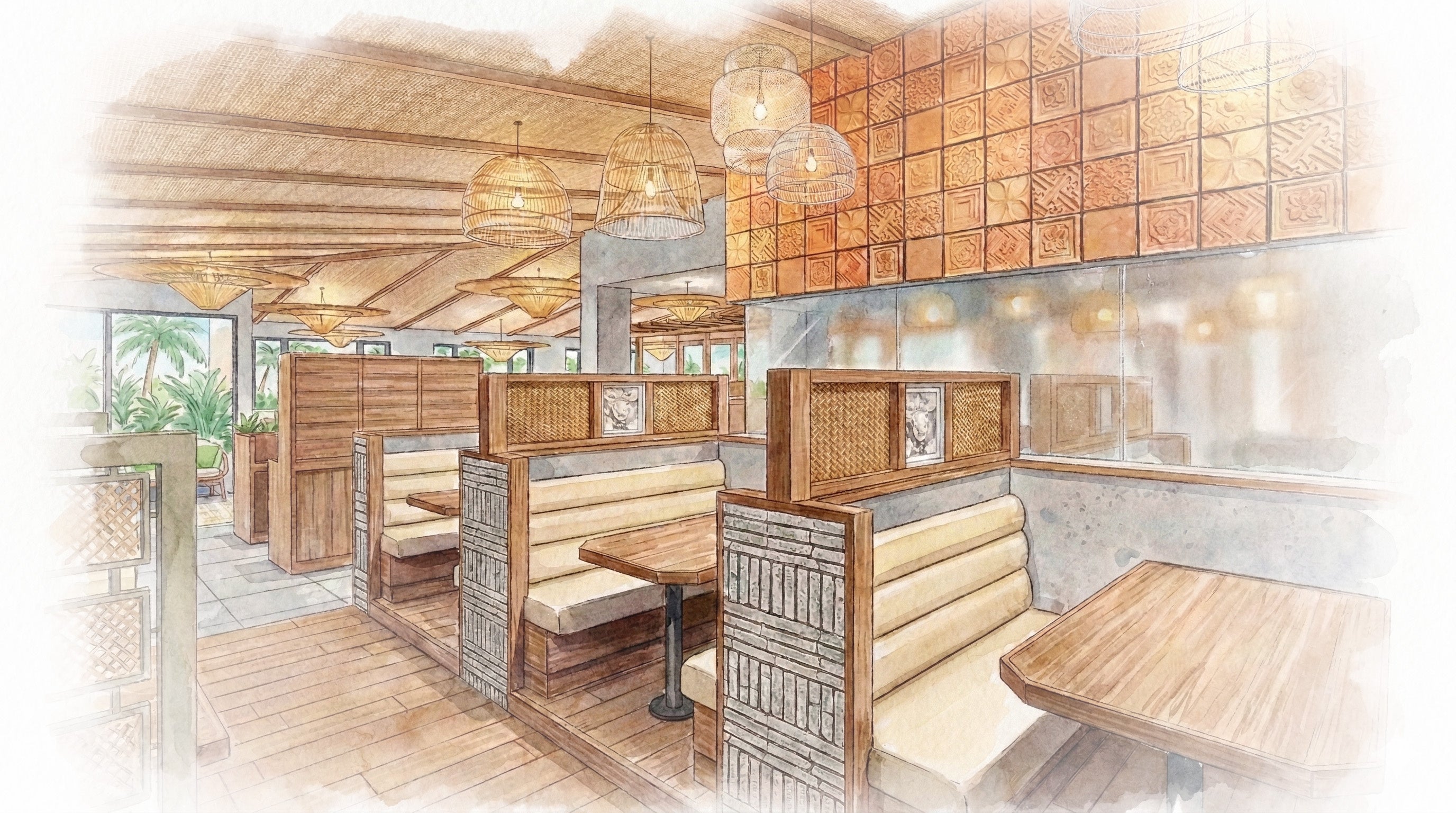 南国のリゾートを思わせる爽やかなインテリア、そして日常を忘れさせてくれるゆったりとした空間設計。岡山浜野店はご家族でのお食事、記念日、気の合う仲間との語らいなど、その日の気分やシーンに合わせて34卓、130席の空間をご用意しております。