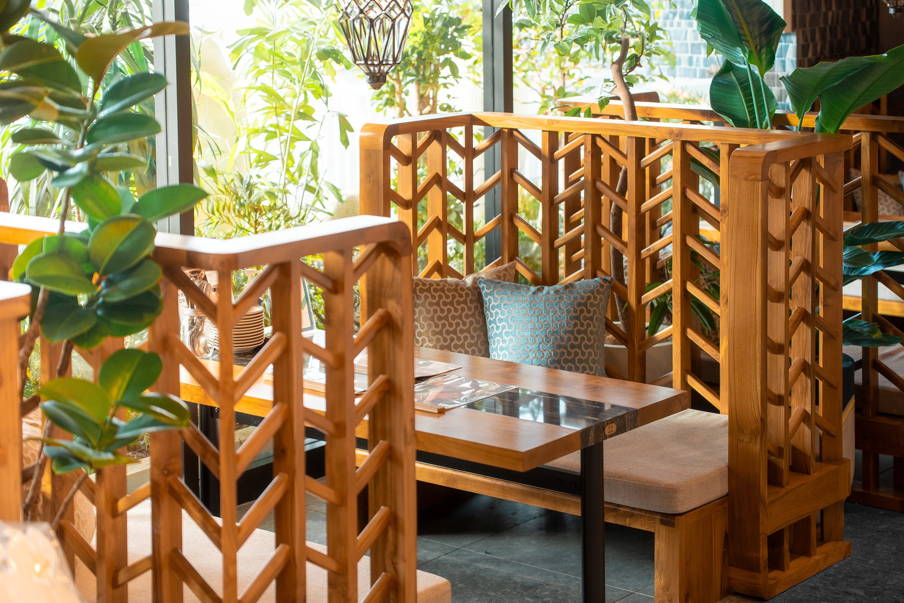 バリ島で直接選定した、現地の職人による手作りで造作した大きなラタンの照明が、木の質感を活かした迫力のある空間を演出します。