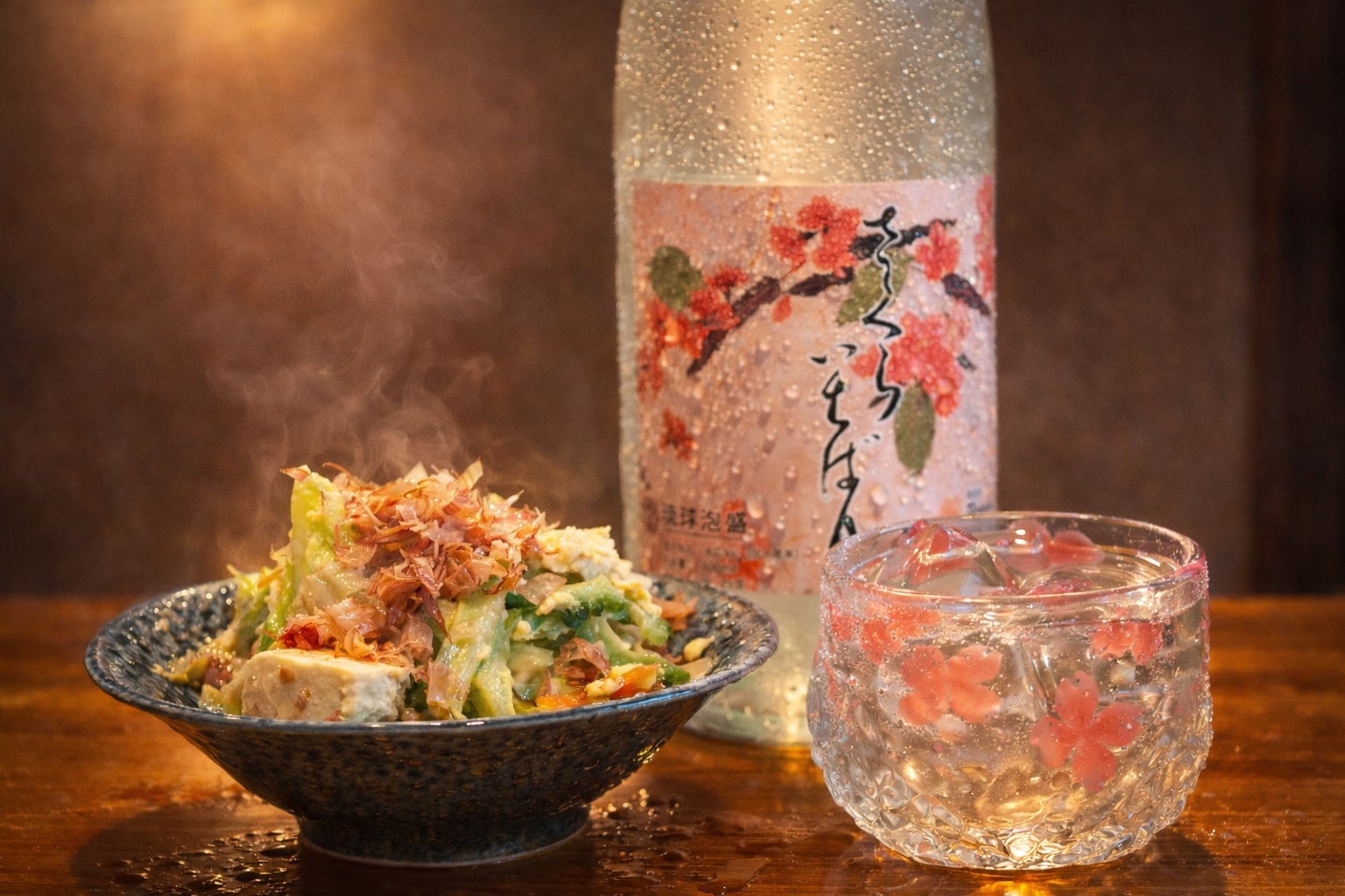 合わせるのは旬の春キャベツとゴーヤーを使った、はりくやまく特製ちゃんぷる~です。シャキシャキと歯切れよい春キャベツの甘み、ゴーヤーのすっきりとした苦み、卵のやさしいコク。それぞれの素材が互いを引き立て合い、一皿の中に沖縄の食卓の豊かさが凝縮されています。そして、このちゃんぷる~こそが、さくらいちばんの真価を引き出す最高の相手です。ゴーヤーの苦みの後に泡盛の甘みが追いかけてくる、その流れは一度体験すると忘れられないものとなります。沖縄の人が長年かけて育ててきた、素朴で正直なペアリングをご堪能ください。
