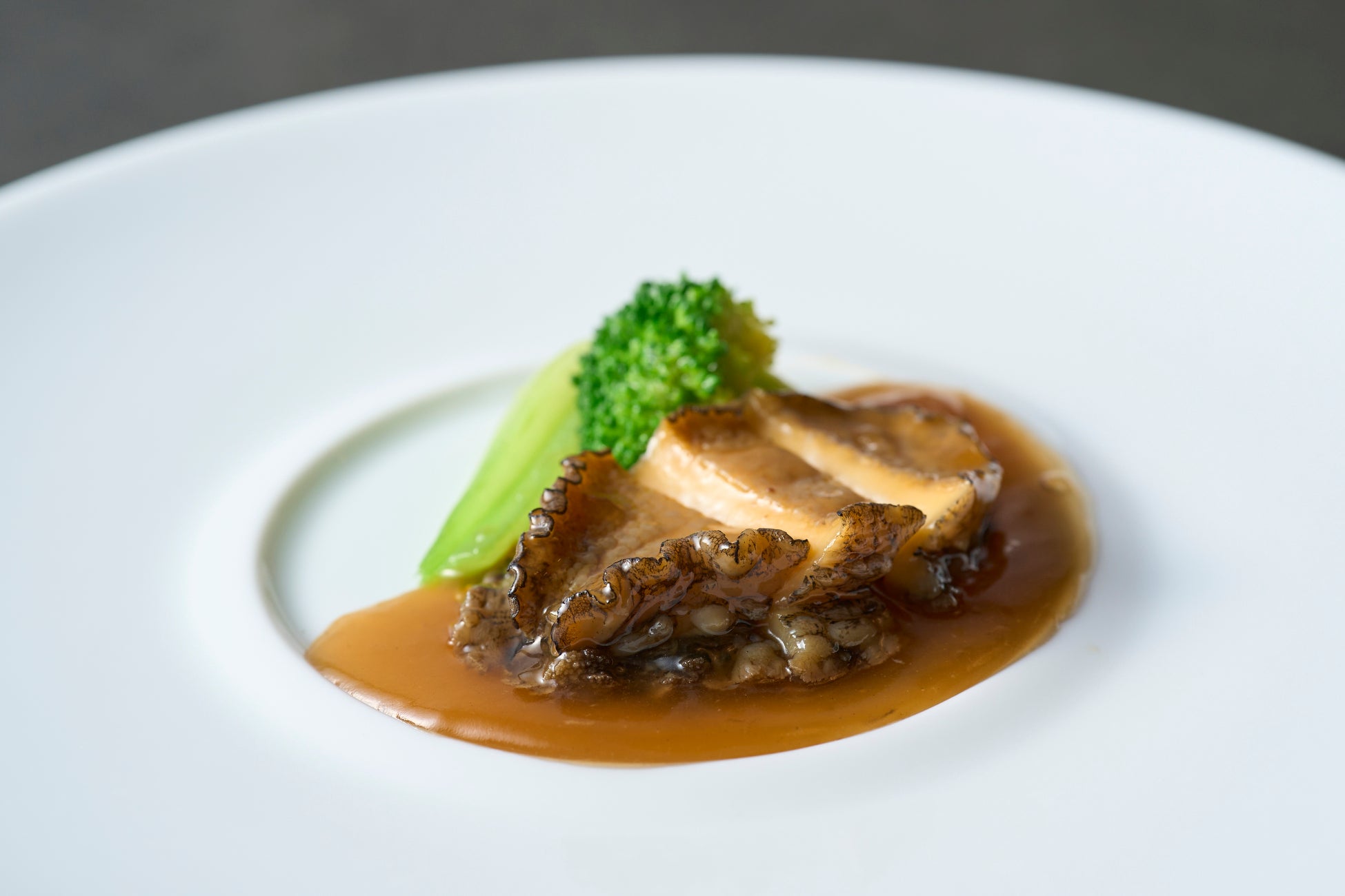 本格広東料理を揃える「中国料理 龍鳳」でご提供する国産鮑のオイスターソース煮込みは、余熱でやさしく火入れすることで、しなやかな口当たりに仕上げています。鶏肉ベースの滋味深いスープにオイスターソースと中国砂糖の氷糖(ピントー)を合わせることで、やさしく上品な一皿をご賞味いただけます。