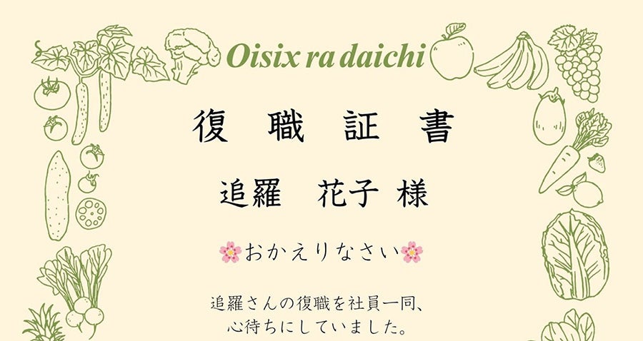 食品のサブスクリプションサービスを提供するオイシックス・ラ・大地株式会社(本社:東京都品川区、代表取締役社長:高島 宏平、以下:当社)は、育休からの復職を支える取り組みとして、復職者を迎える「復職式」を2026年4月24日(金)に実施します。当社では2017年より取り組んでおり、本年で10回目の節目を迎えます。これを機に、これまで培ってきたノウハウを、企業規模や業種を問わず活用できる形で広く公開することで、復職を前向きに迎える文化の醸成を目指し、本年は公開イベントとして開催します。