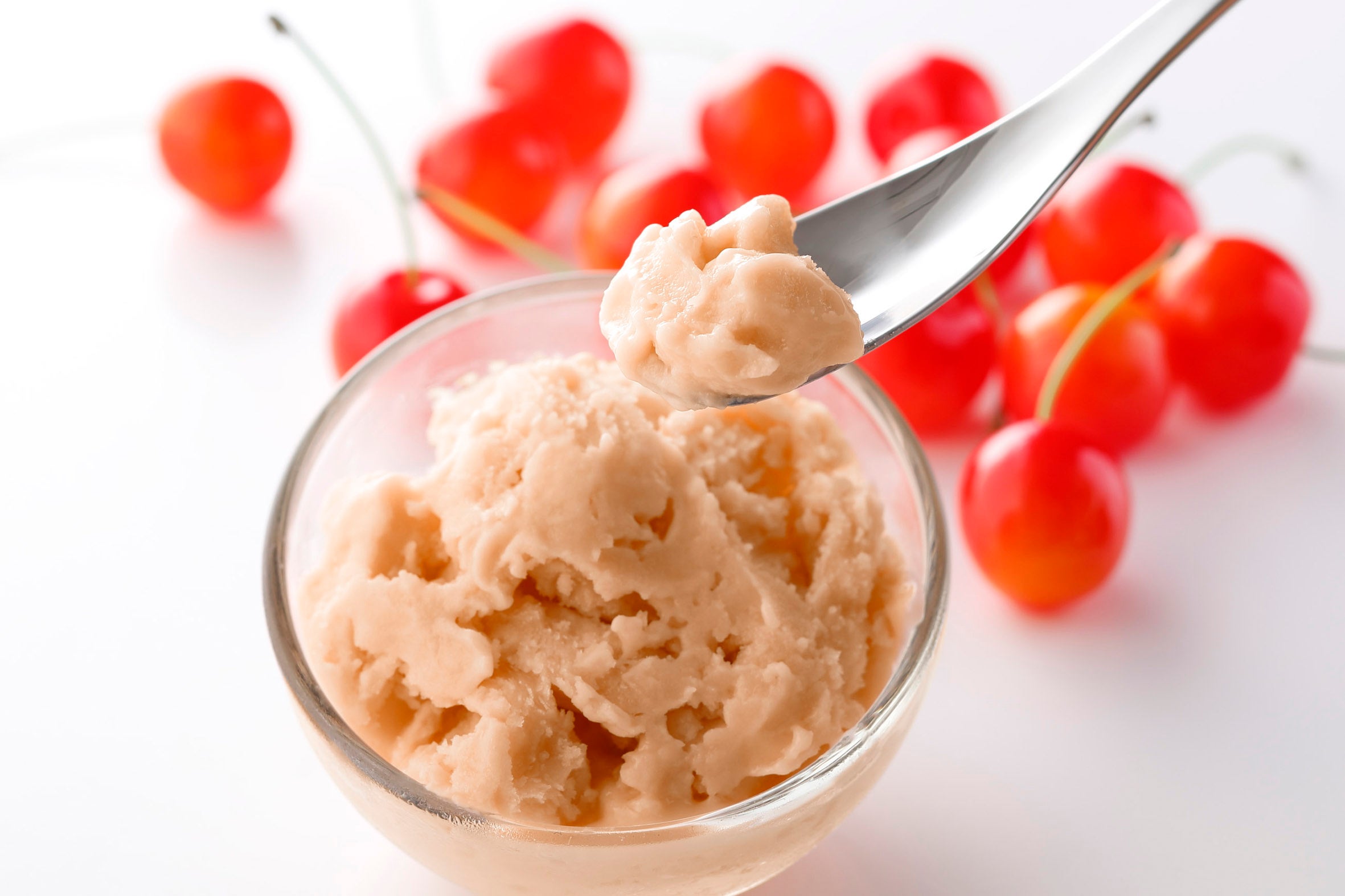 北海道産の生クリーム、岡山県蒜山高原で育ったジャージー牛のミルクに山形県産佐藤錦の果汁をあわせた、甘さと酸味のバランスが絶妙な一品。
