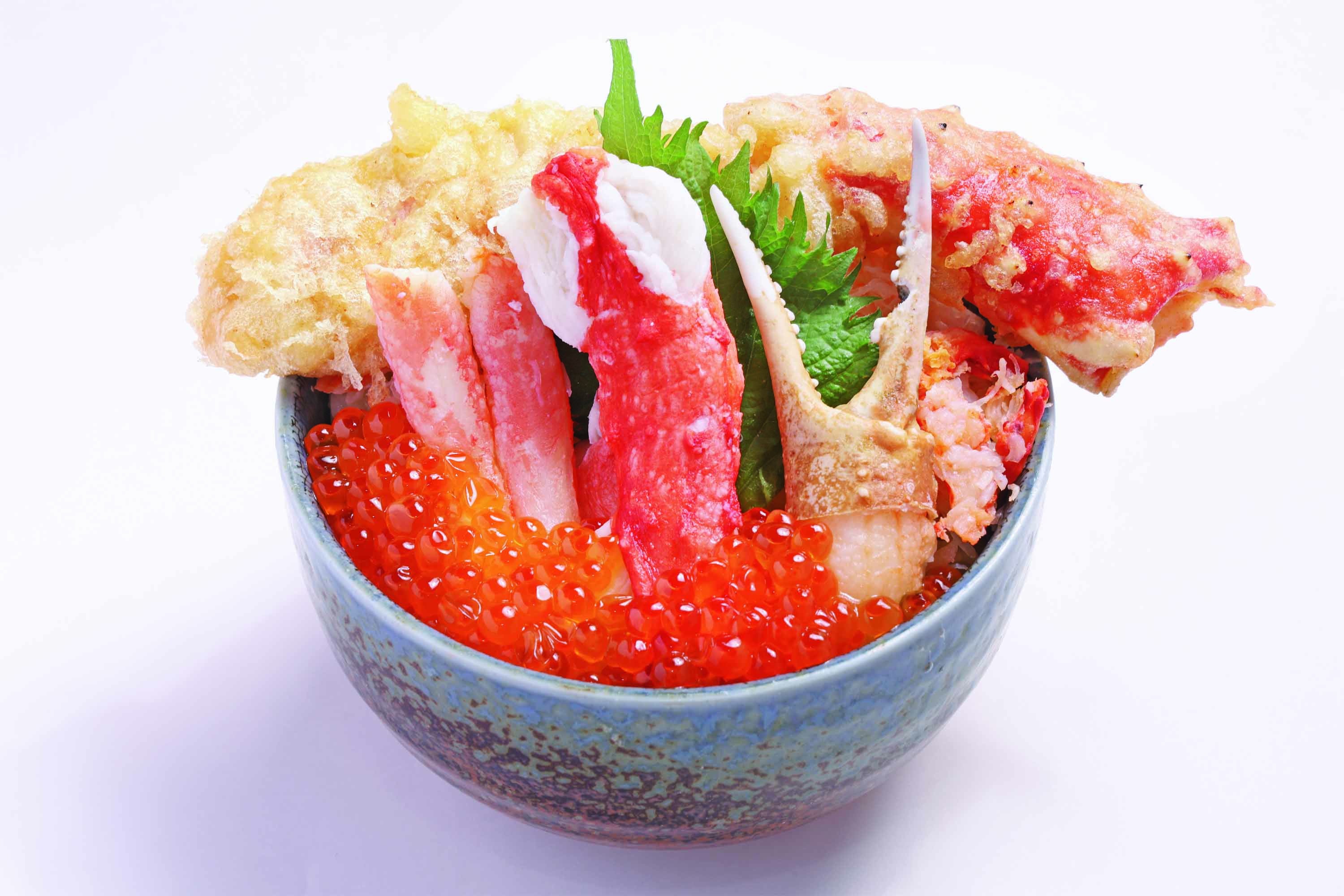 ボリュームたっぷりのタラバカニを天ぷらに。3種の蟹を存分に味わえる贅沢丼