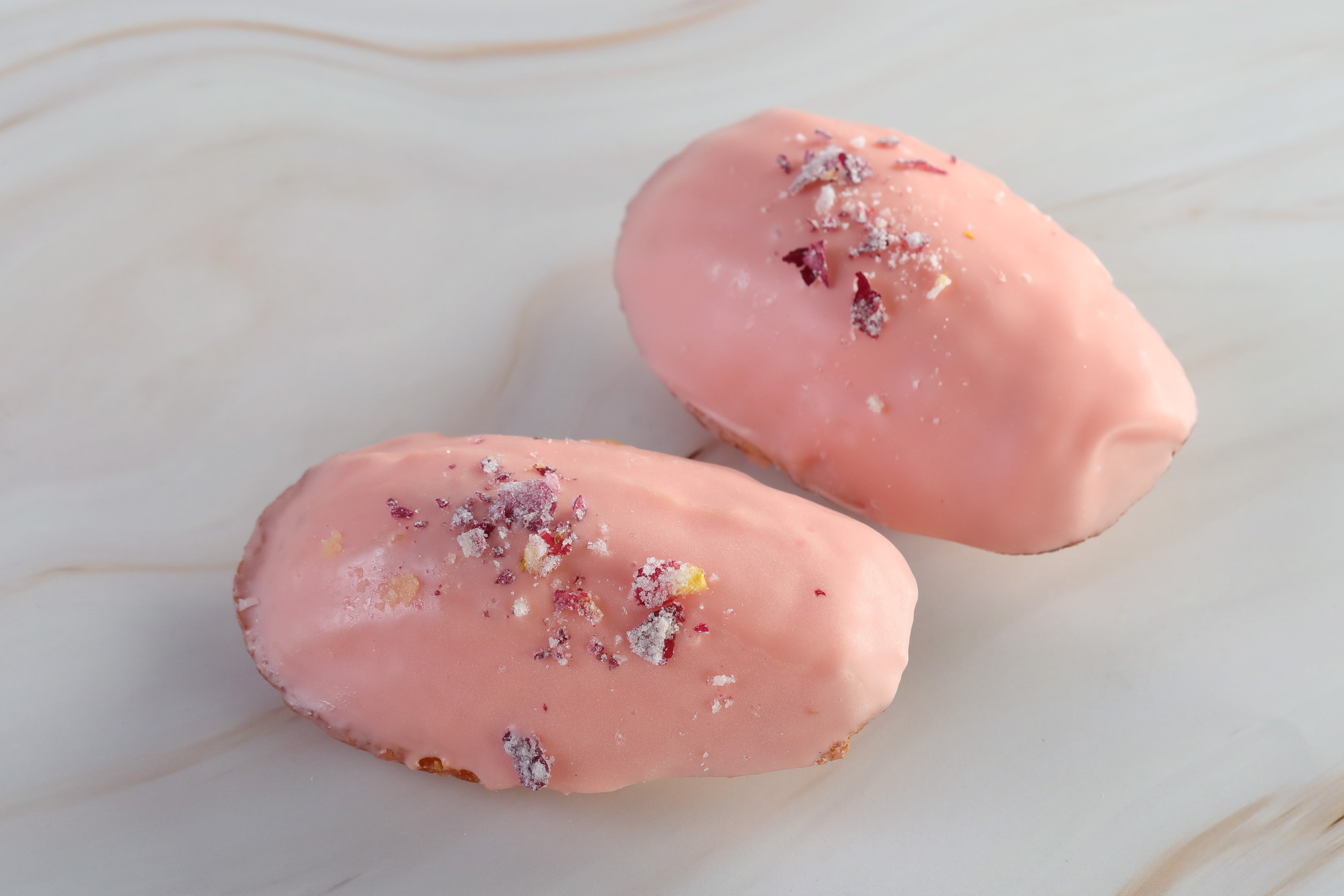 レモン味のマドレーヌにバラフレーバーのチョコレートをコーティングした、さわやかな味わいの焼菓子です。