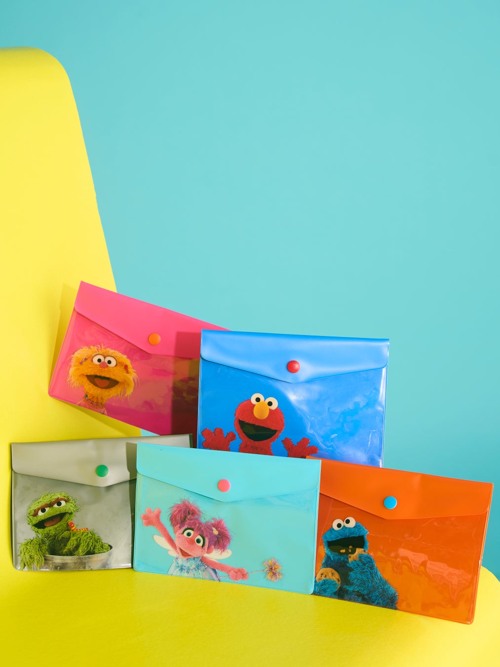 (左上より時計回り:ピンク(ゾーイ)、ブルー(エルモ)、オレンジ(クッキーモンスター)、ミント(アビー)、グレー(オスカー))
