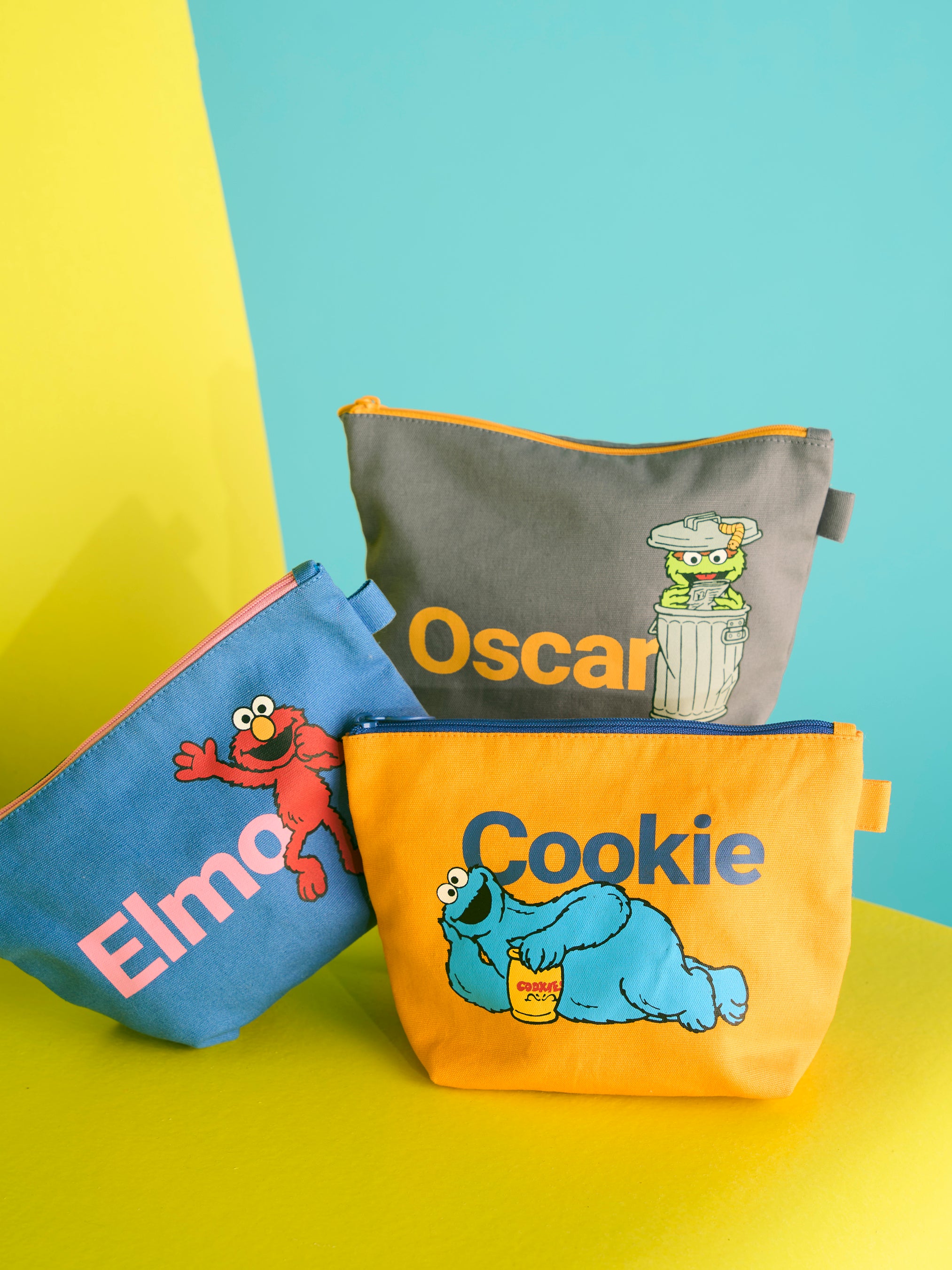ご機嫌に手を振るエルモ、ごろんとくつろぎながらクッキーをほおばるクッキーモンスター、ペットのスライミーと一緒に新聞を読むオスカーをプリントした、カラフルでポップなカラーリングが目を惹くキャンバスポーチ。