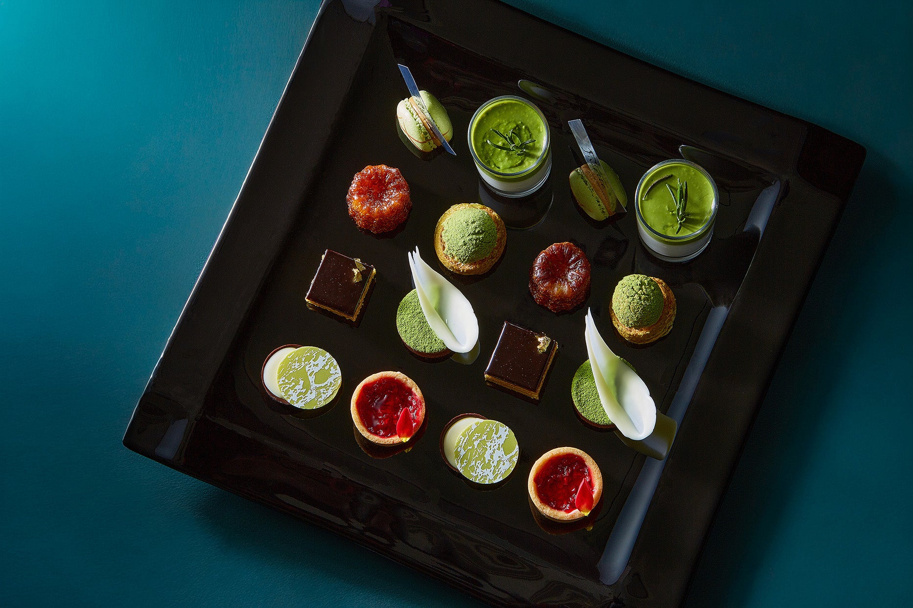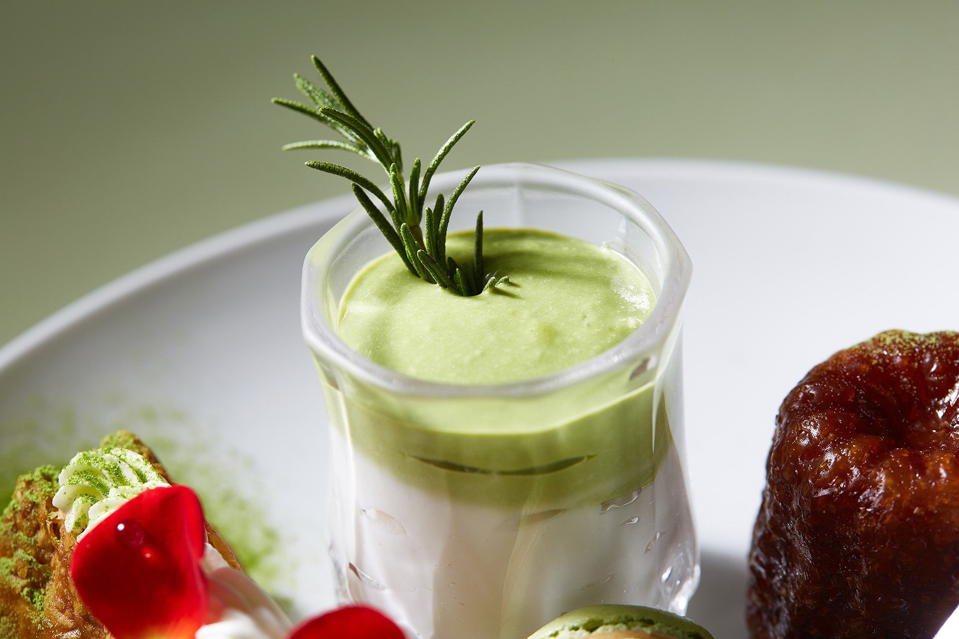 抹茶やピスタチオを使用したスイーツを中心に、見た目と味わいともに爽やかな品々が並ぶアフタヌーンティーは、まるで新緑の風景をそのまま閉じ込めたかのような逸品。
