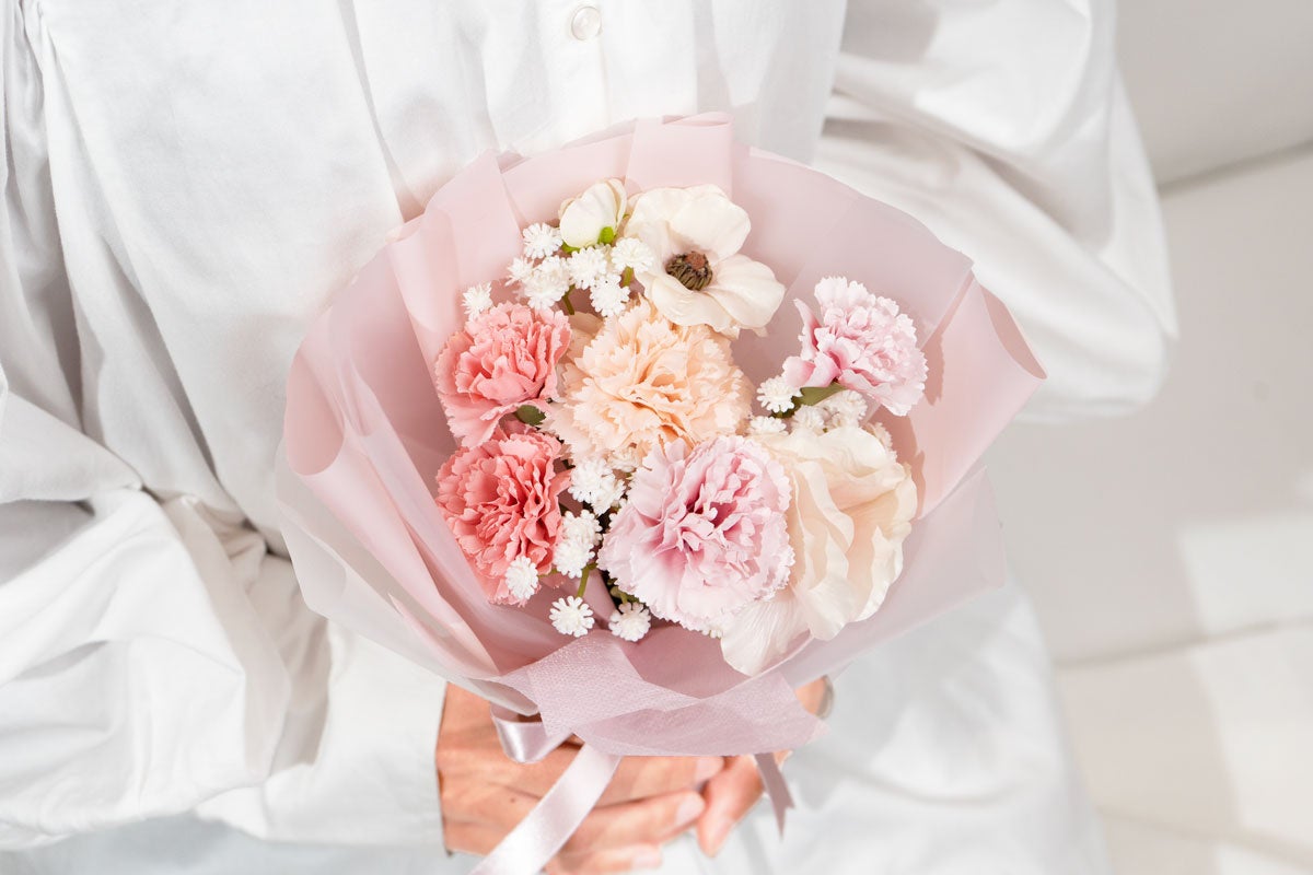 母の日を象徴するカーネーションを中心に、リュクスラナンキュラスやカスミソウをセレクト。