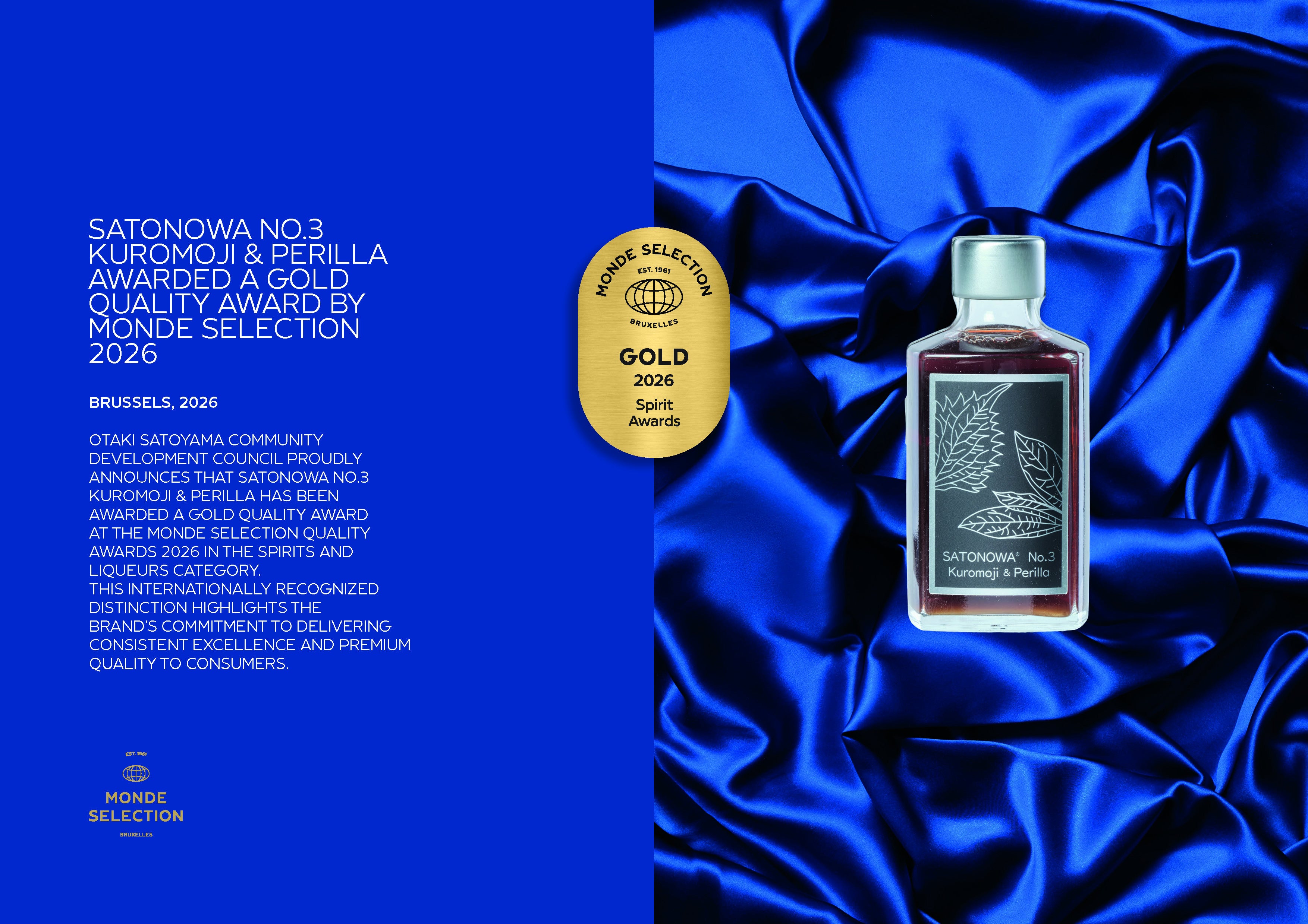 このたび、里和浸酒 SATONOWA® No.3 クロモジ&赤シソは、2026年モンドセレクション スピリッツ&リキュール部門において、Gold Quality Award(金賞)を受賞しました。