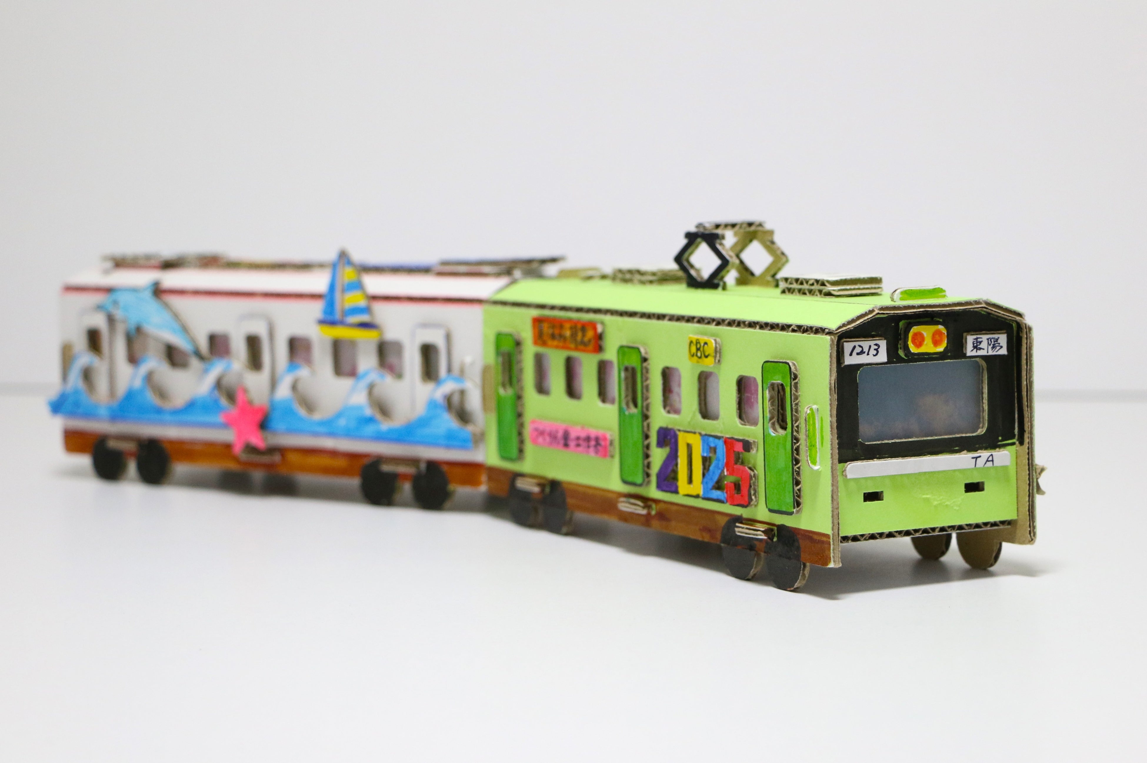 ダンボールで組み立てられた電車の土台にドアや窓、パンタグラフなどほかにも様々なパーツを自由に貼り付けてオリジナル電車を作ります。夜には、中にセットしてあるLEDライトを点灯してランタンのように光らせて楽しむこともできます。※車輪は回らないタイプです。