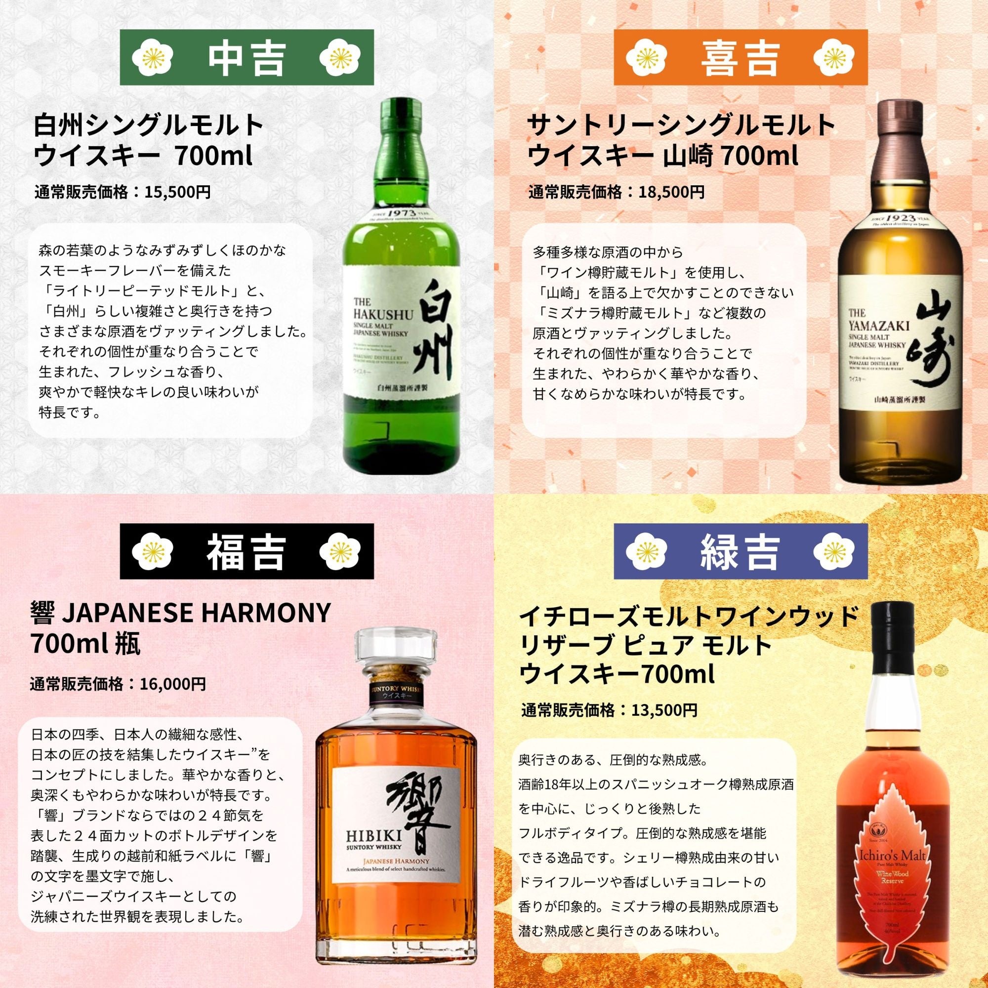 品薄で手に入らない幻のウイスキーである「山崎18年」を筆頭に、「白州18年」「竹鶴17年」といった入手困難な長期熟成ボトルを封入しています。