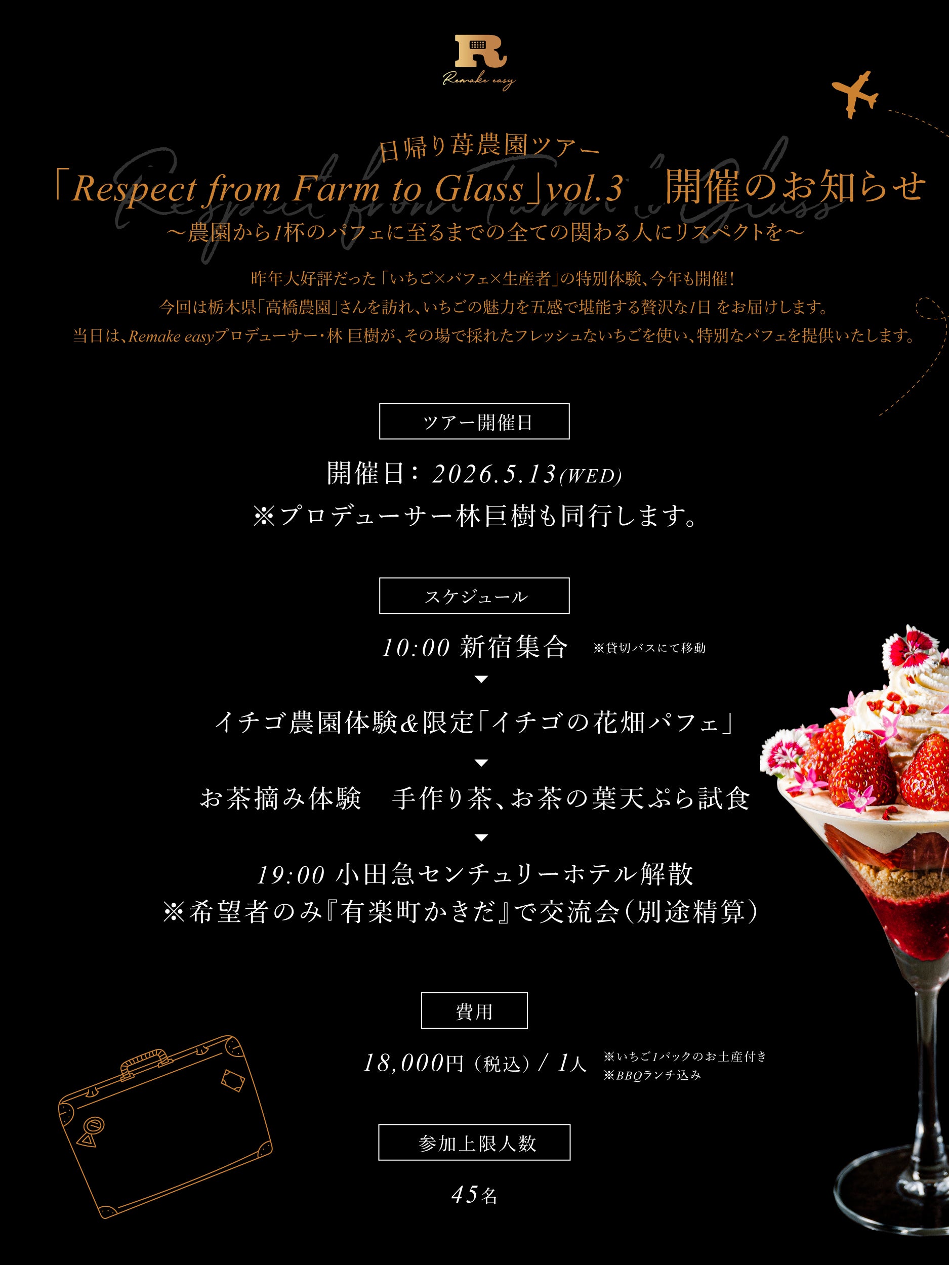住所非公開の会員制パフェバー『Remake easy(リメイクイージー)』を運営するRemake easy株式会社 (東京都渋谷区、CEO:林巨樹、以下「Remake easy」)は、昨年好評を博した体験型イベント「Respect from Farm to Glass」の第3弾として、埼玉県の農園を巡る日帰りツアーを2026年5月13日(水)に開催いたします。