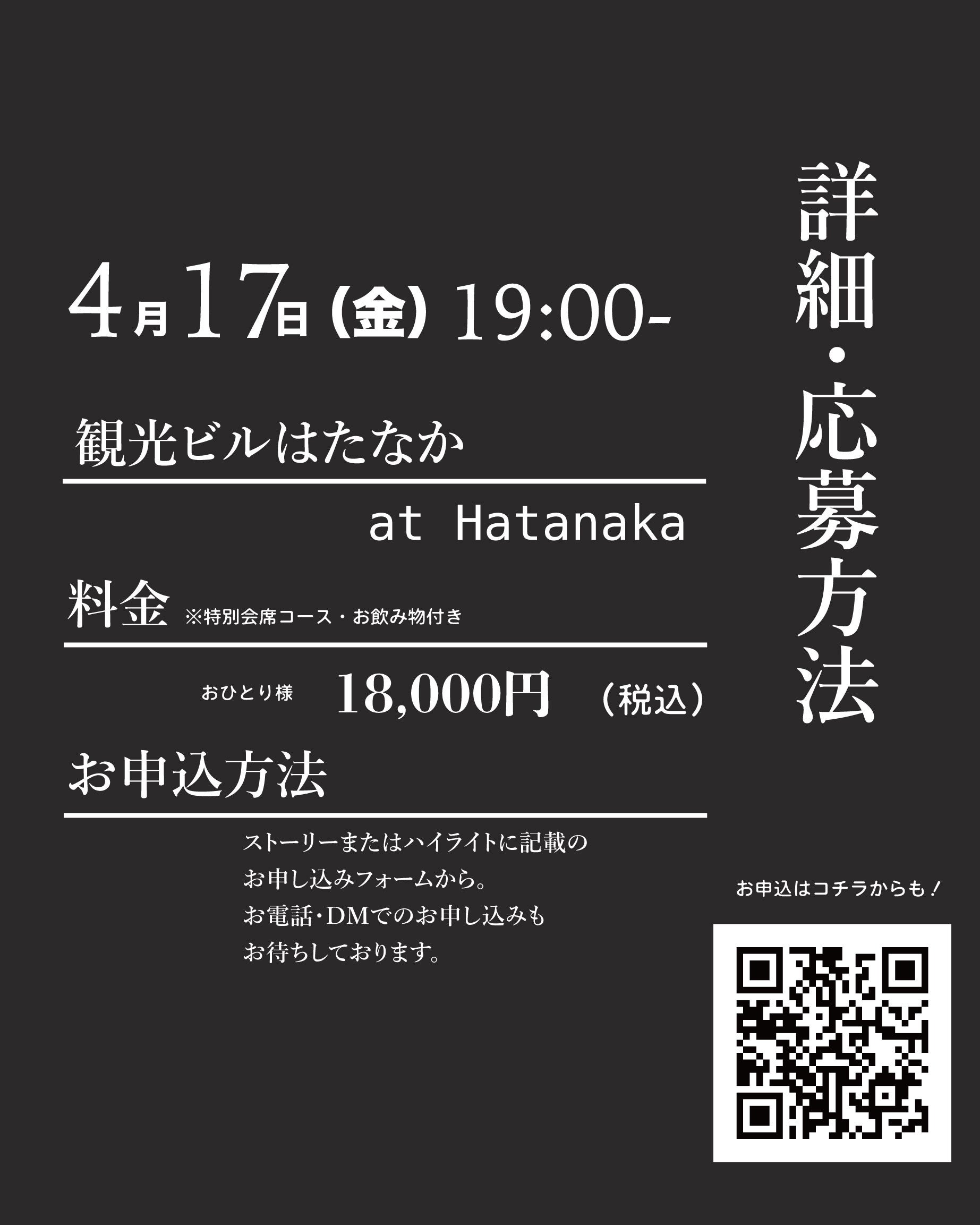 普段は厨房に立つ料理人が、この夜は来場者の前に立ち、料理を仕上げていく体験型の食の場です。宴会ではなく、料理と向き合う時間を提案します。