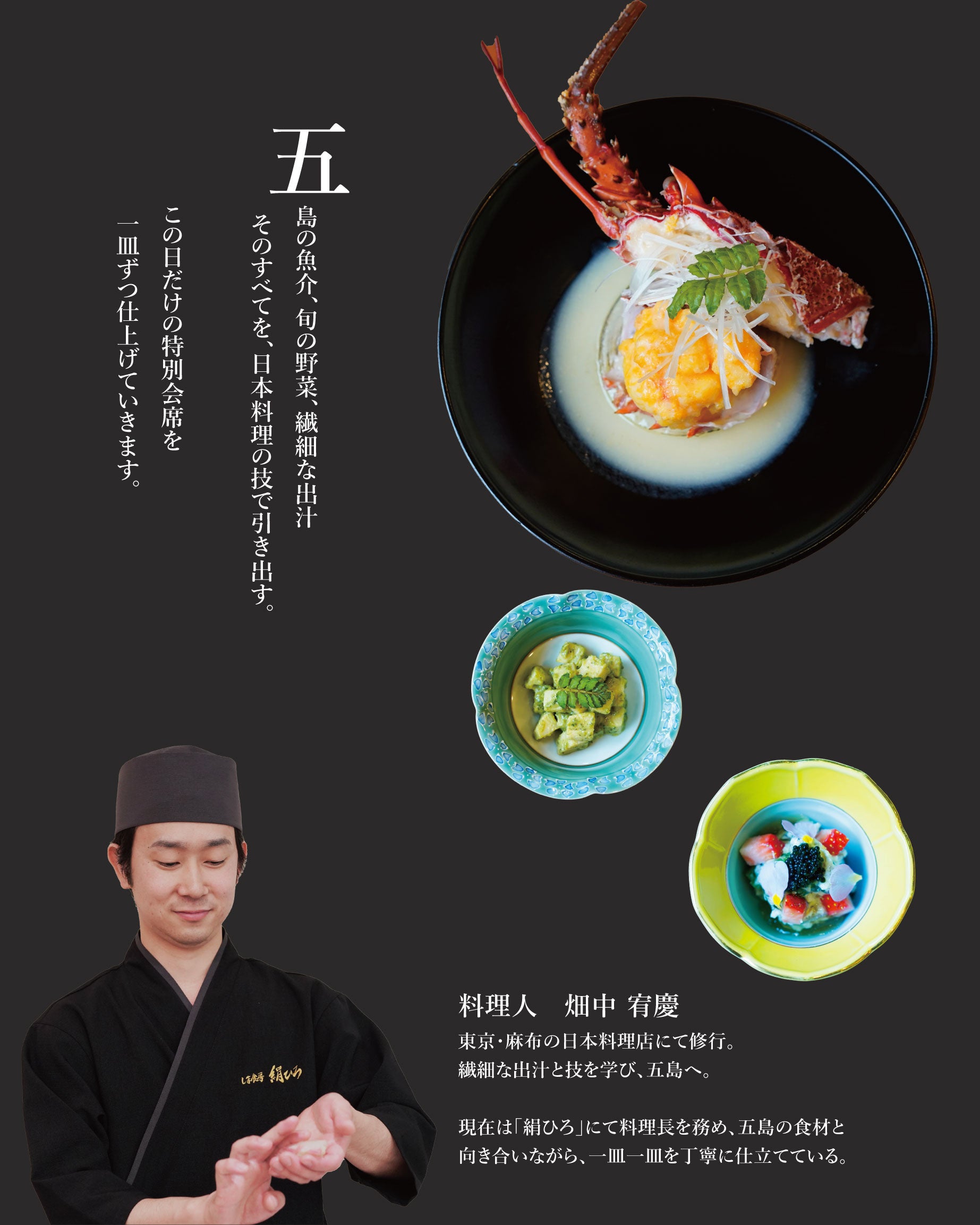 料理人・畑中宥慶による特別会席。五島の魚介や旬の野菜を中心に、一皿ごとに丁寧に仕立てたコースを提供します。