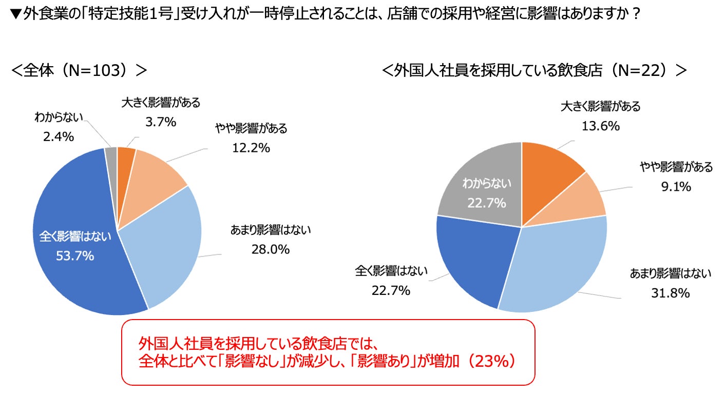 外国人社員を採用している飲食店に限定すると、「全く影響はない」は22.7%に減少し、「やや影響がある」(9.1%)と「大きく影響がある」(13.6%)を合わせた「影響あり」は22.7%となり、全体と比べて「影響なし」が減少し、「影響あり」が増加しました。