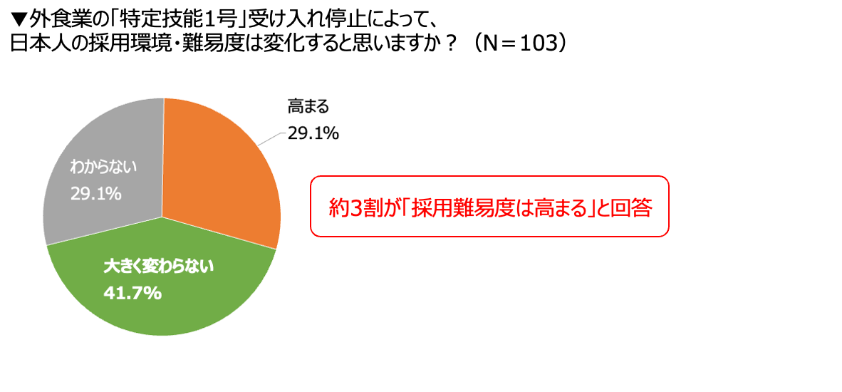 次に、「特定技能1号」の受け入れ一時停止で日本人採用の難易度が高まるかについて聞いたところ、「高まる」と回答した飲食店は29.1%にのぼり、約3割が日本人採用の難易度が上昇すると見込んでいることが分かりました。一方で、「大きく変わらない」が41.7%と最も多い結果となったほか、「わからない」も29.1%と一定数存在しており、今後の影響の見通しが立っていない状況がうかがえます。