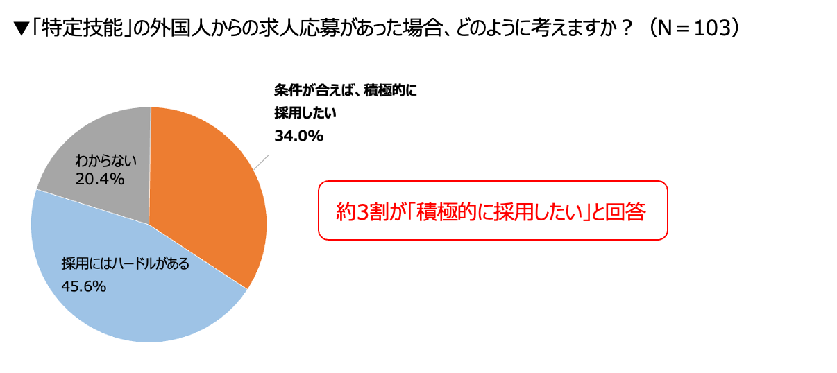 「特定技能」の外国人からの応募に対し、34%が「条件が合えば積極的に採用したい」と回答