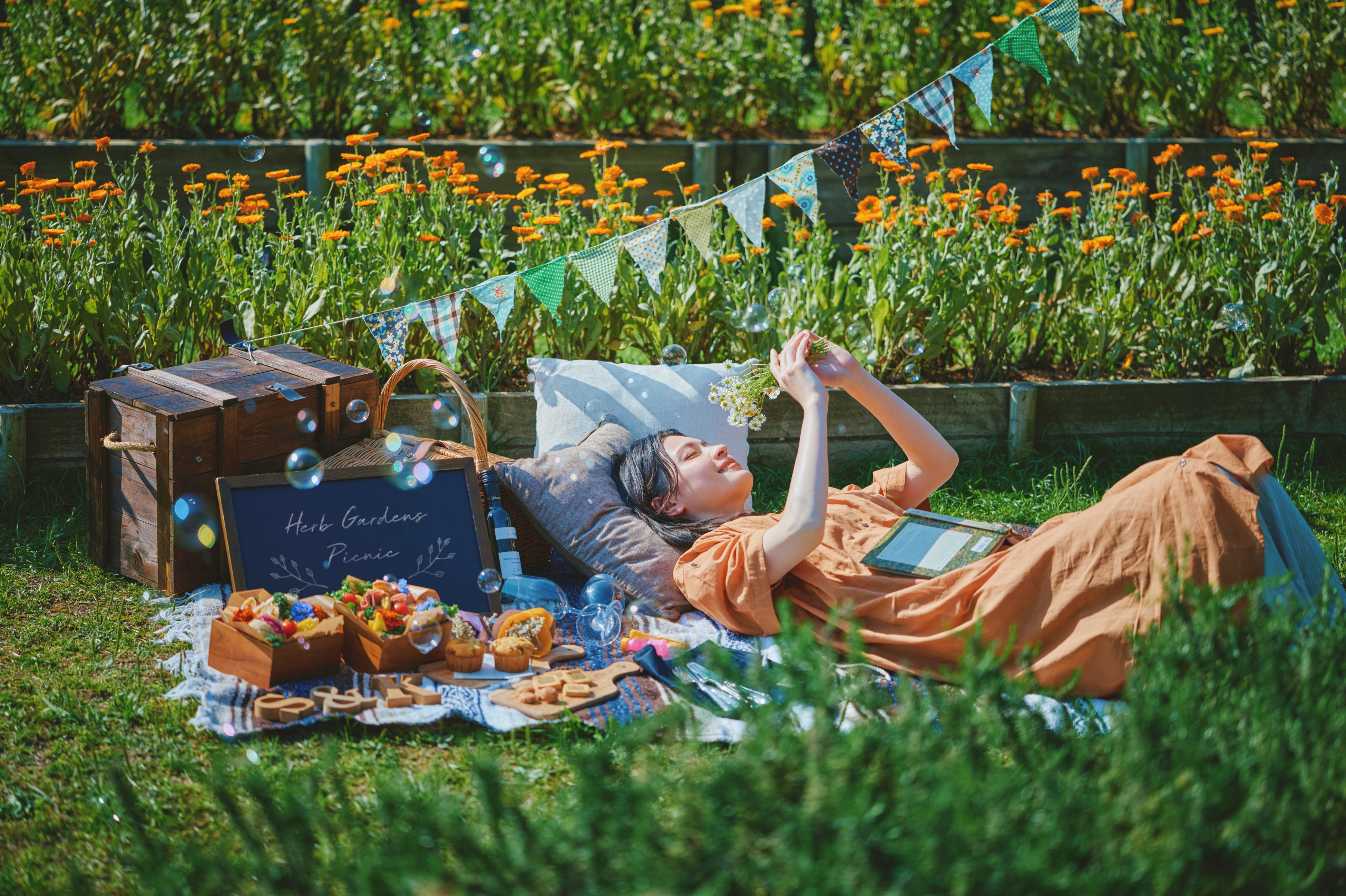 神戸布引ハーブ園のピクニックは、ガーデンが舞台。開放感あふれる園内には、花、ハーブ、芝生、ベンチ、テーブル、東屋などピクニックシーンを彩るロケーションが点在しています。バスケットを片手に、お気に入りの場所を探しながら、最高のおしゃピクを満喫しませんか