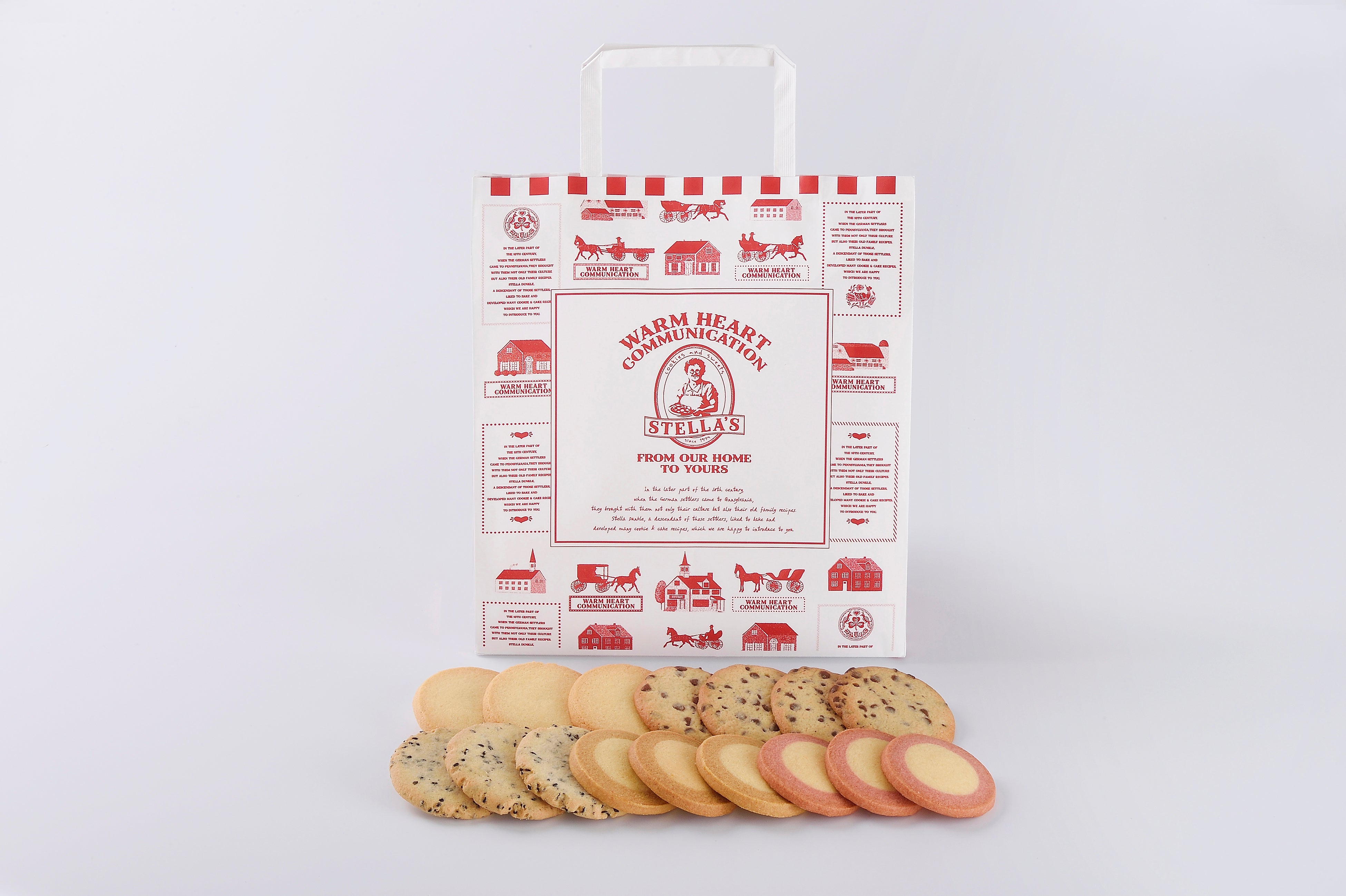 ショップのオープンを記念して、4月17日(金)より、数量限定で、大変お得なお楽しみ袋を数量限定で販売いたします。ステラおばさんのクッキーを代表するフレーバーが、たっぷり16枚入っています。