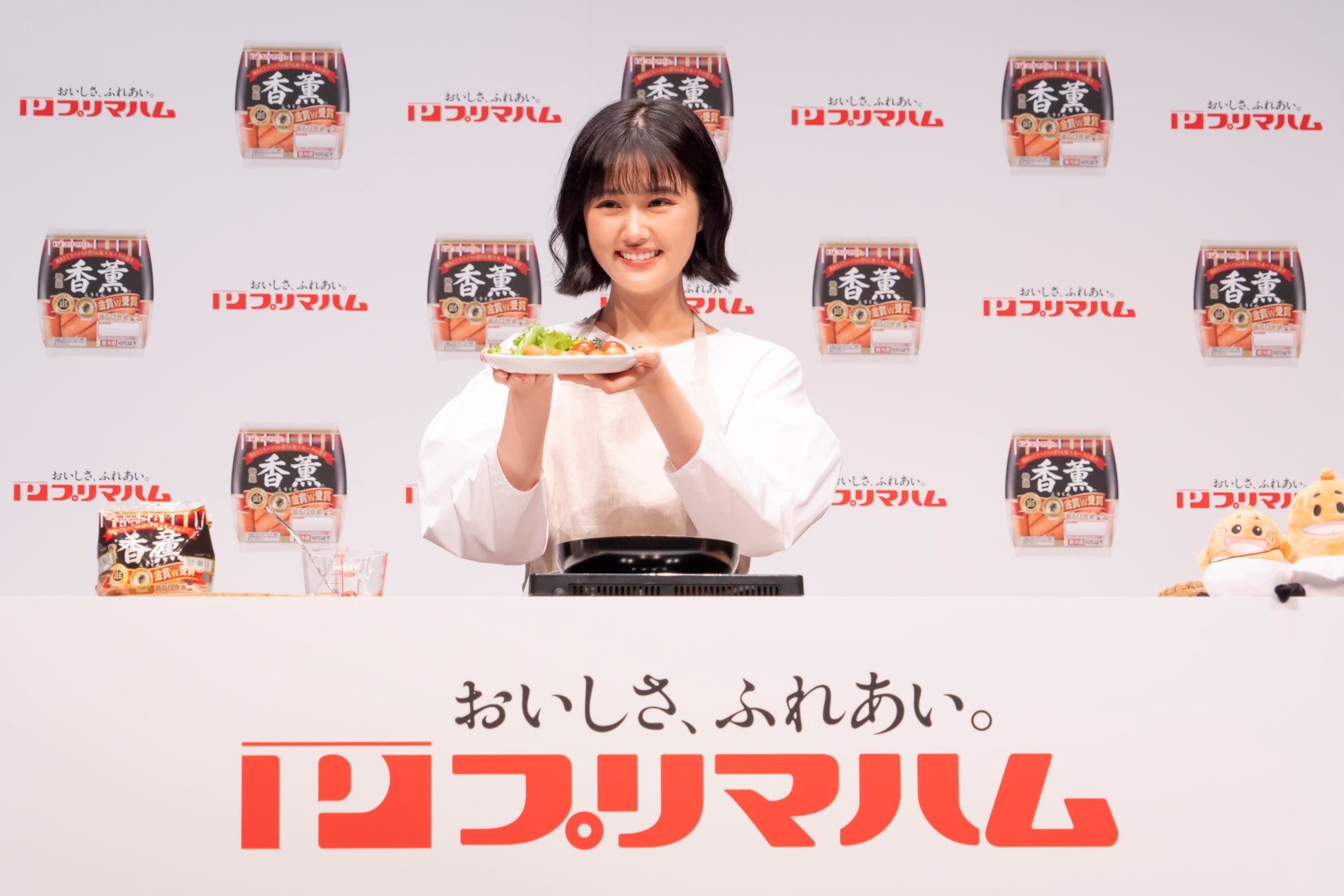 CM上映後、MCの呼びかけにより、原菜乃華さんがプリマハム香薫キャラクター、あらびき星人「ソップリン」と仲良く腕を組んで登場。原さんは「香薫®の幸せな香りを、今日はお届けしに来ました!」とチャーミングにコメントしました。その後、CMの見どころや撮影エピソードについて、「セットがとても可愛らしく、実は後ろで流れている歌も私が実際に歌わせていただきました。おなじみの曲を歌うことができて、とてもうれしかったです。また、撮影現場も非常に和気あいあいとした雰囲気でした」と満面の笑みで語りました。