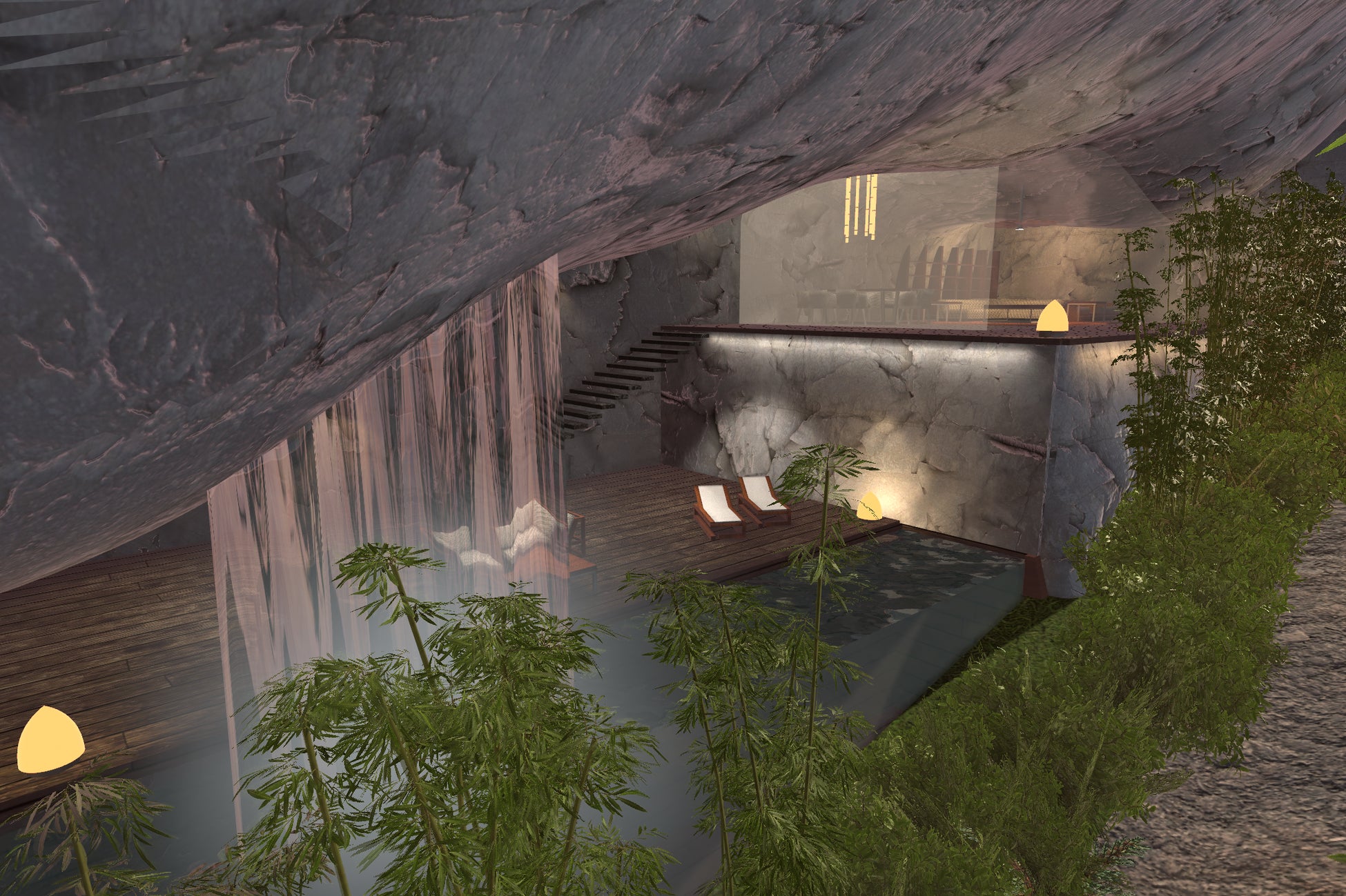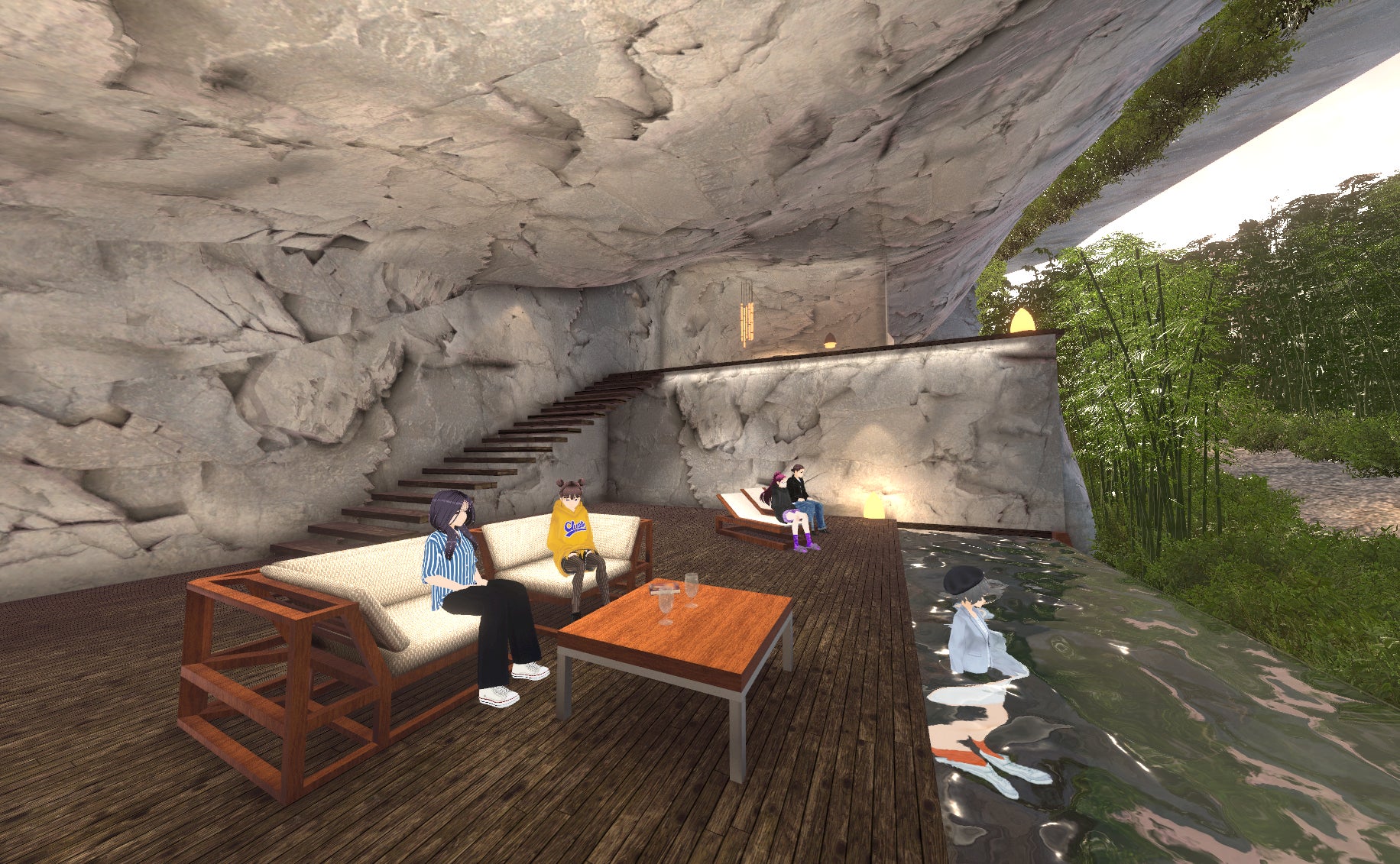 2層吹き抜けの優雅な空間。専用プールや滝を配し、竹林の静寂を感じる安息の別天地です。招待権限は20名まで。