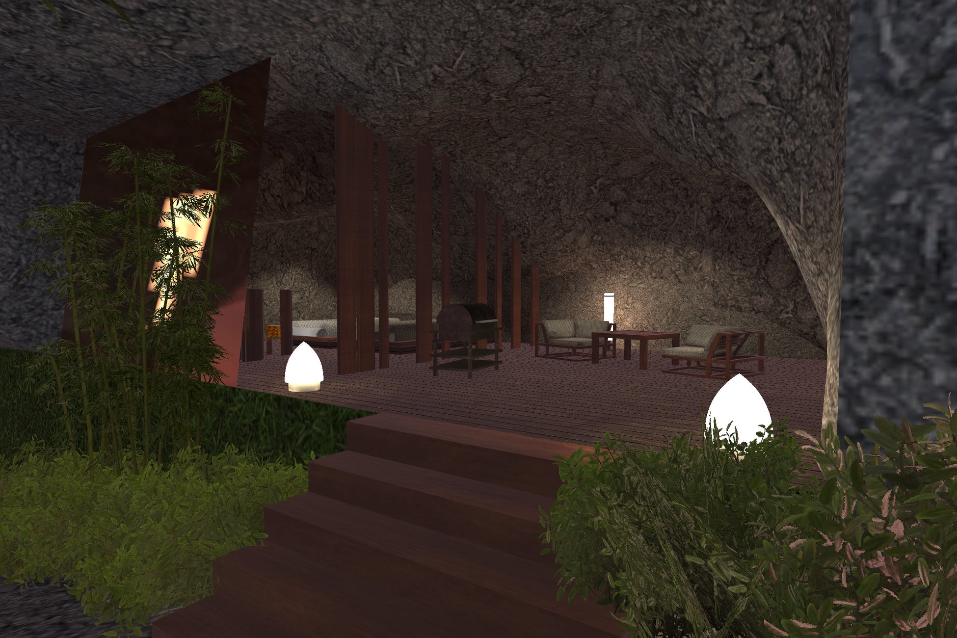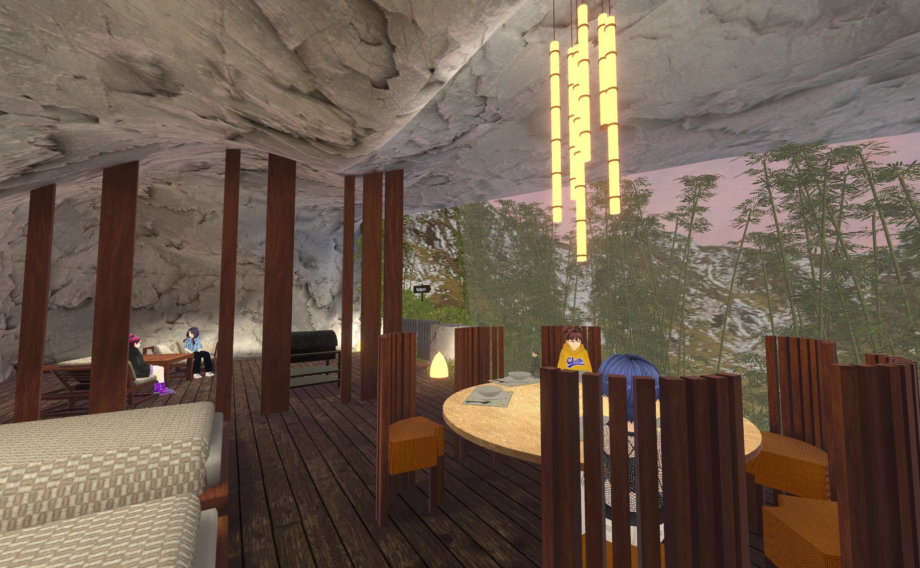 「あの家」を現代的にアップデートした3タイプを用意しました。空間には間接照明がたけのこ型、ライトが竹のデザインなど、ブランドの世界観を随所に散りばめています。