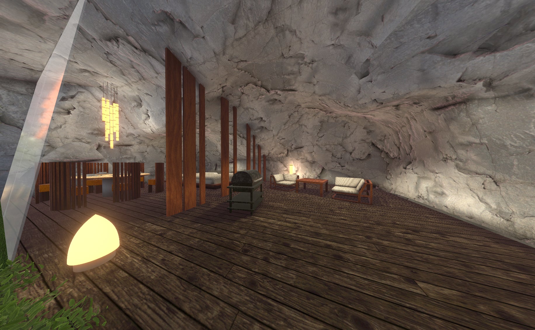 炎を囲み、BBQや食事を愉しむ団欒の屋内スペース。