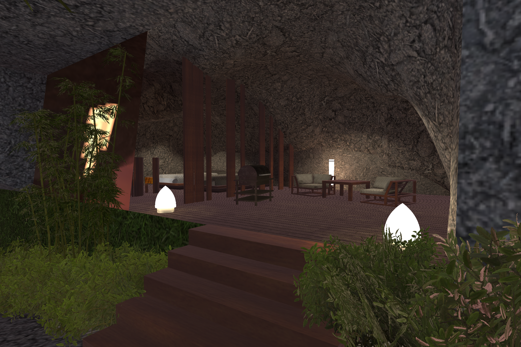 炎を囲み、BBQや食事を愉しむ団欒の屋内スペース。