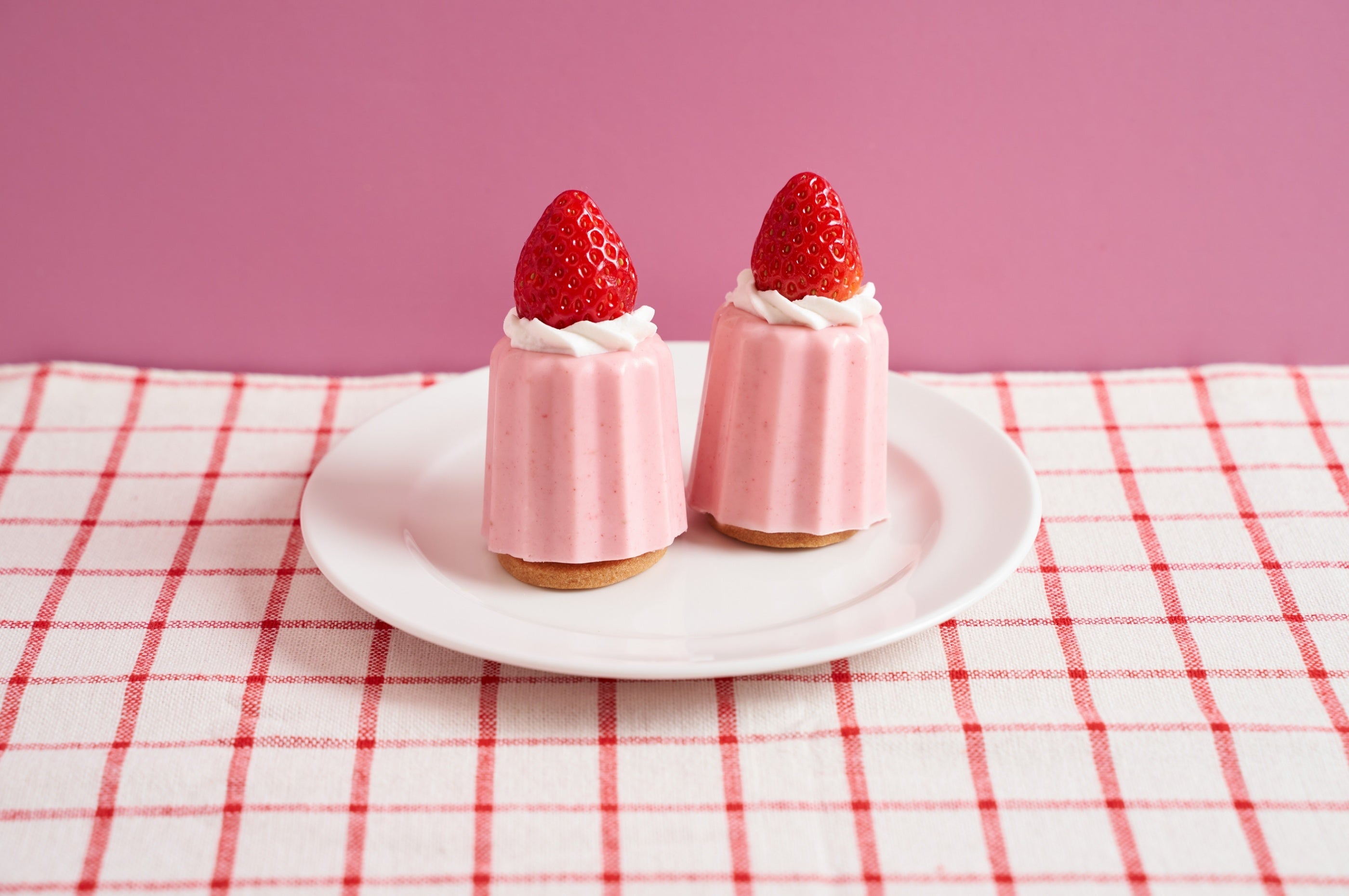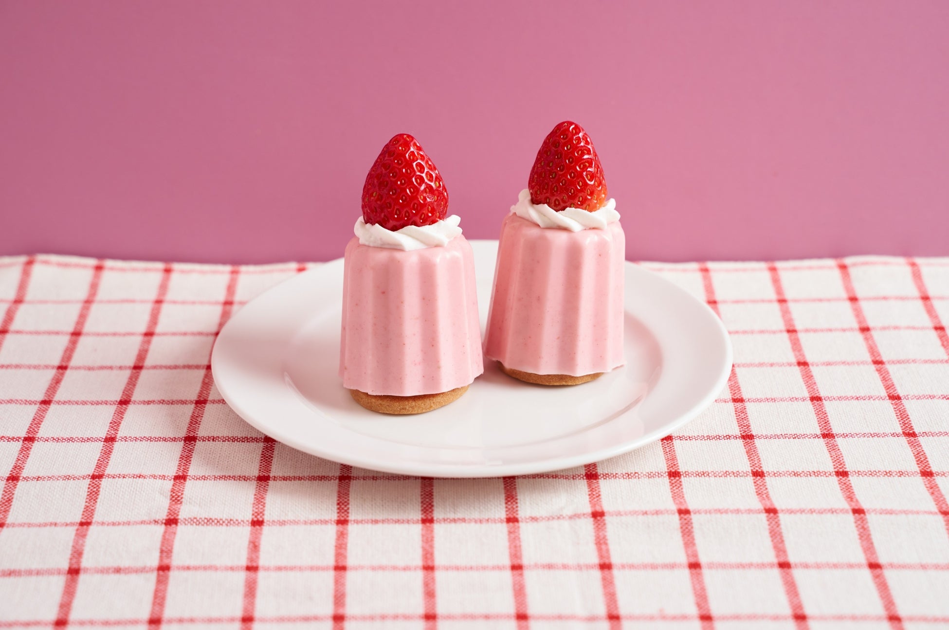 いちごが丸ごと2個味わえる、いちごのキャンドル型のピンクチョコスイーツ。サブレの上に、生クリームとカスタード、いちごをのせ、春らしいピンクチョコで包みました。