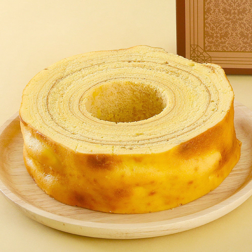 平泉藤原三代の黄金に込めた祈りを、バウムクーヘンで表現。平泉産の金しゃり米(栽培期間中農薬不使用)、黄金の雑穀、黄金の里卵を使用。
