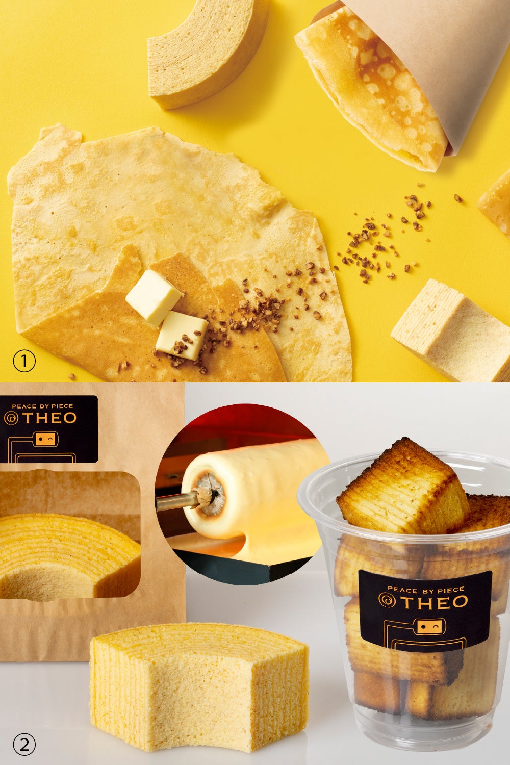 ユーハイムが開発したバウムクーヘンAI職人の「THEO」。「THEO」が作ったバウムクーヘン生地を使用した、「バウムクーヘンフリット」と「バウムクレープ」が登場します。