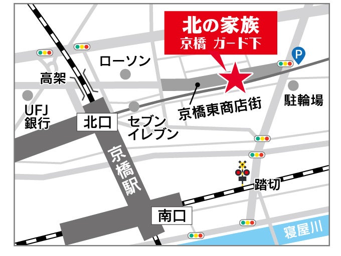 アクセス:JR大阪環状線「京橋駅」から徒歩4分。京橋商店街内に当店がございます。