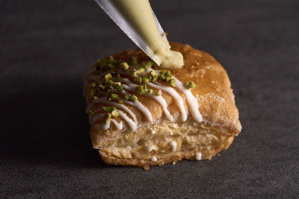 何層にも丁寧にバターを練りこんだパイ生地を、オーブンの中でふっくらと膨らませ、表面はキャラメリゼして香ばしく焼き上げました。
