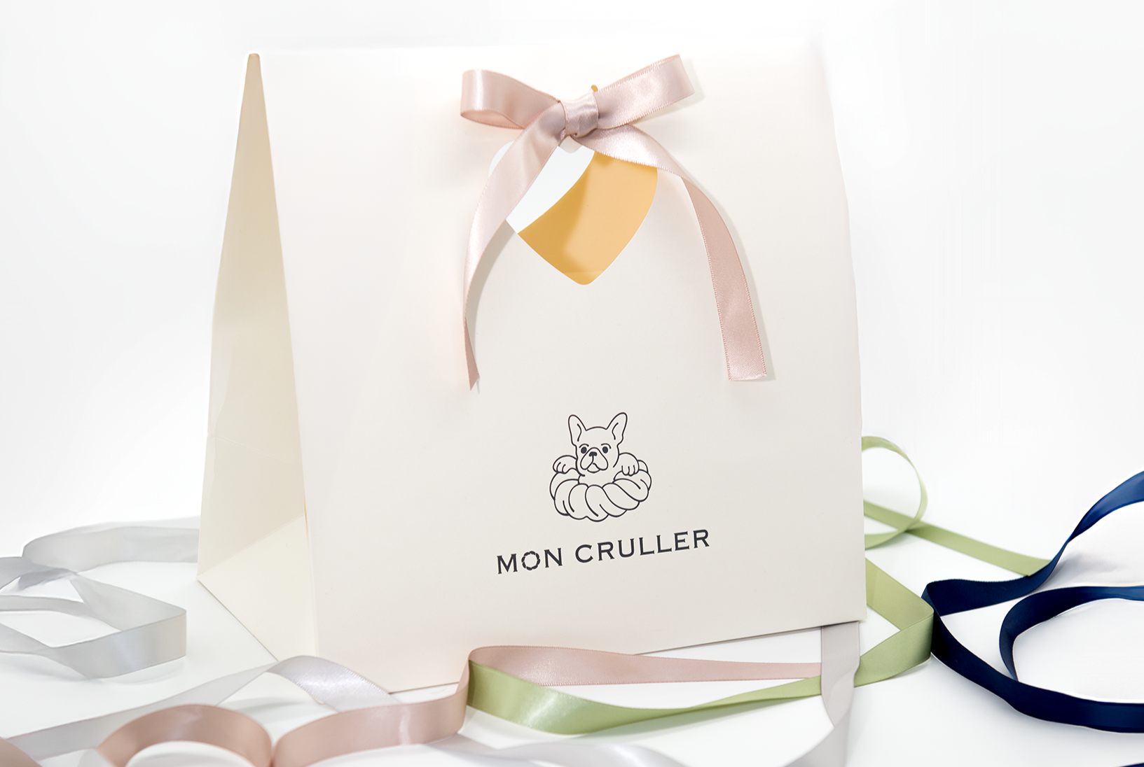 MON CRULLER(モンクルーラー)は、2025年12月に大阪・北新地に誕生した西日本初のフレンチクルーラー専門店です。ペールグリーンで統一された店舗とパッケージ、そしてオリジナルキャラクターのフレンチブルドッグを用いた世界観が特徴です。