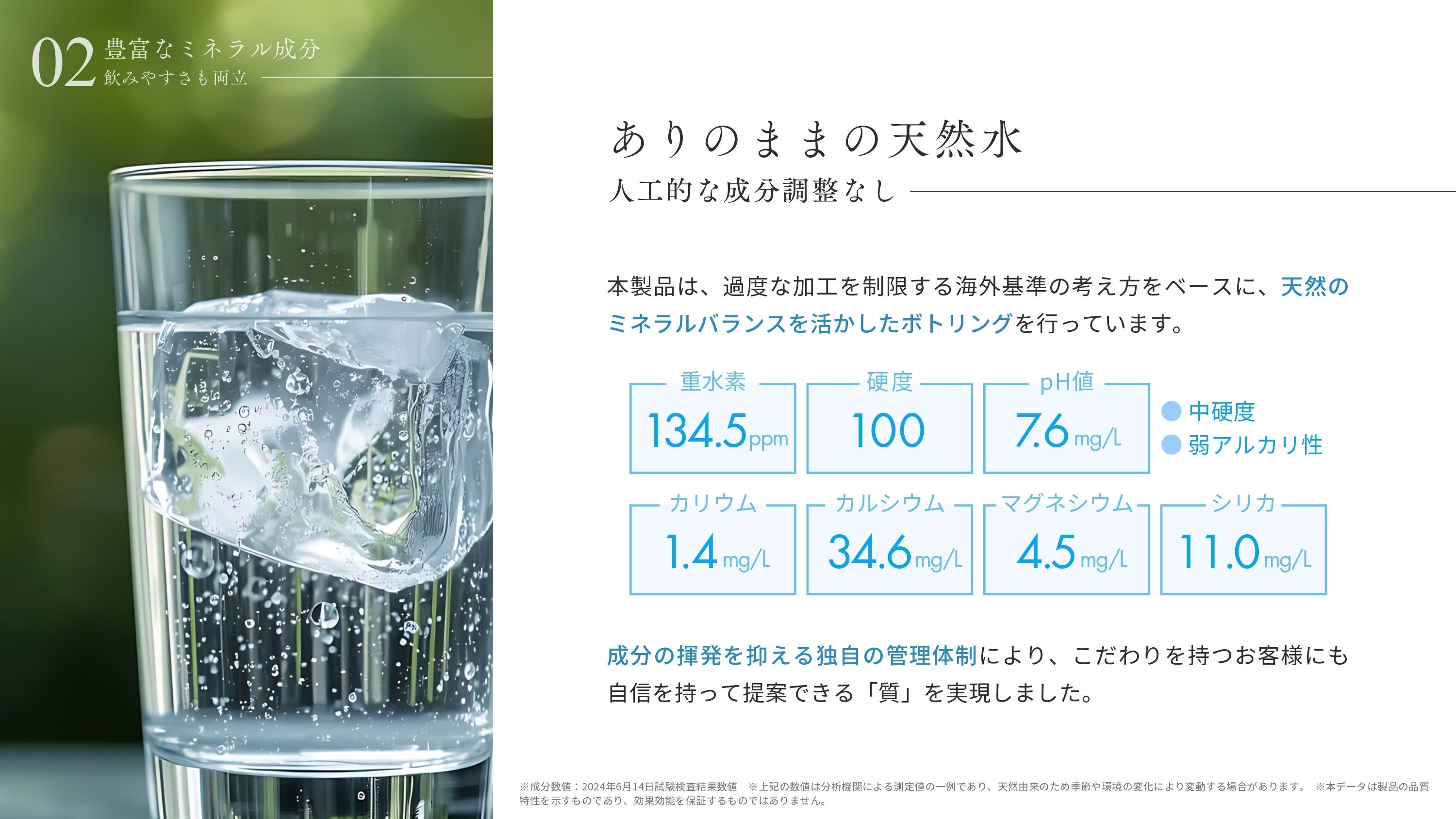 pH7.6の自然な飲み心地と、日常に取り入れやすい中硬水であることが特長です。