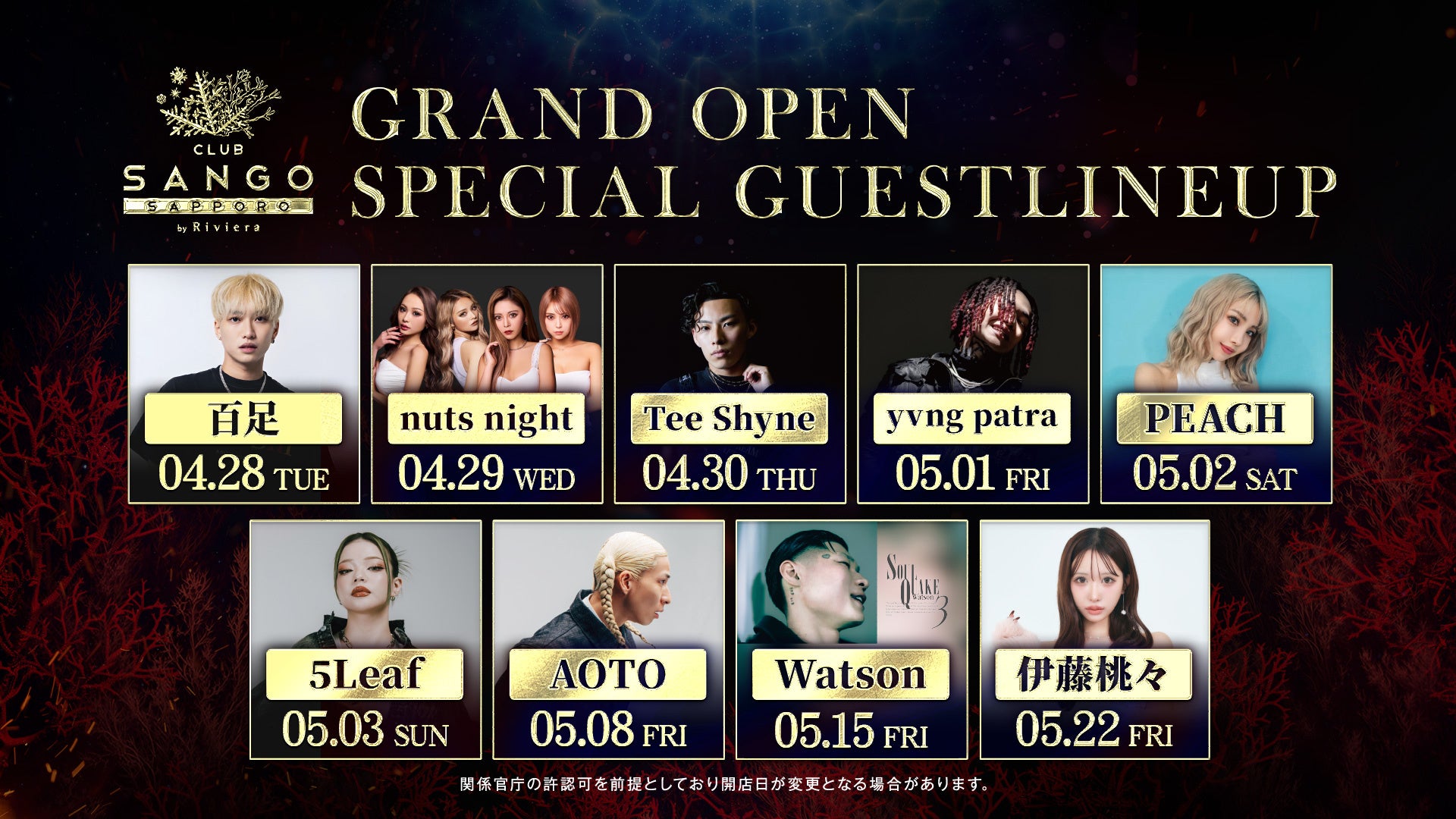 かつての名門「Riviera」跡地に誕生し、最新テクノロジーで完全刷新された「SANGO SAPPORO」。ゴールデンウィークのグランドオープンを華やかに彩るべく、国内外で活躍する豪華ゲストアーティストたちの出演が決定いたしました。