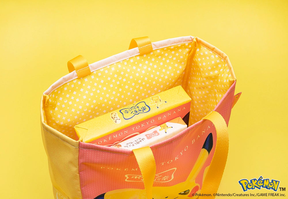再販が決定したピカチュウバッグセットのトートバッグは、「ピカチュウ東京ばな奈」のパッケージを思い起こすデザイン。大容量で持ち手も長めなので、お買い物にも大活躍すること間違いなしです!中は黄色の生地に、さりげなくモンスターボールの模様が入っています。「ピカチュウ東京ばな奈 8個入」と「はみ出しチョコのクッキーサンド 12枚入」が1つずつ入ったセットなので、お土産にもおすすめですよ。