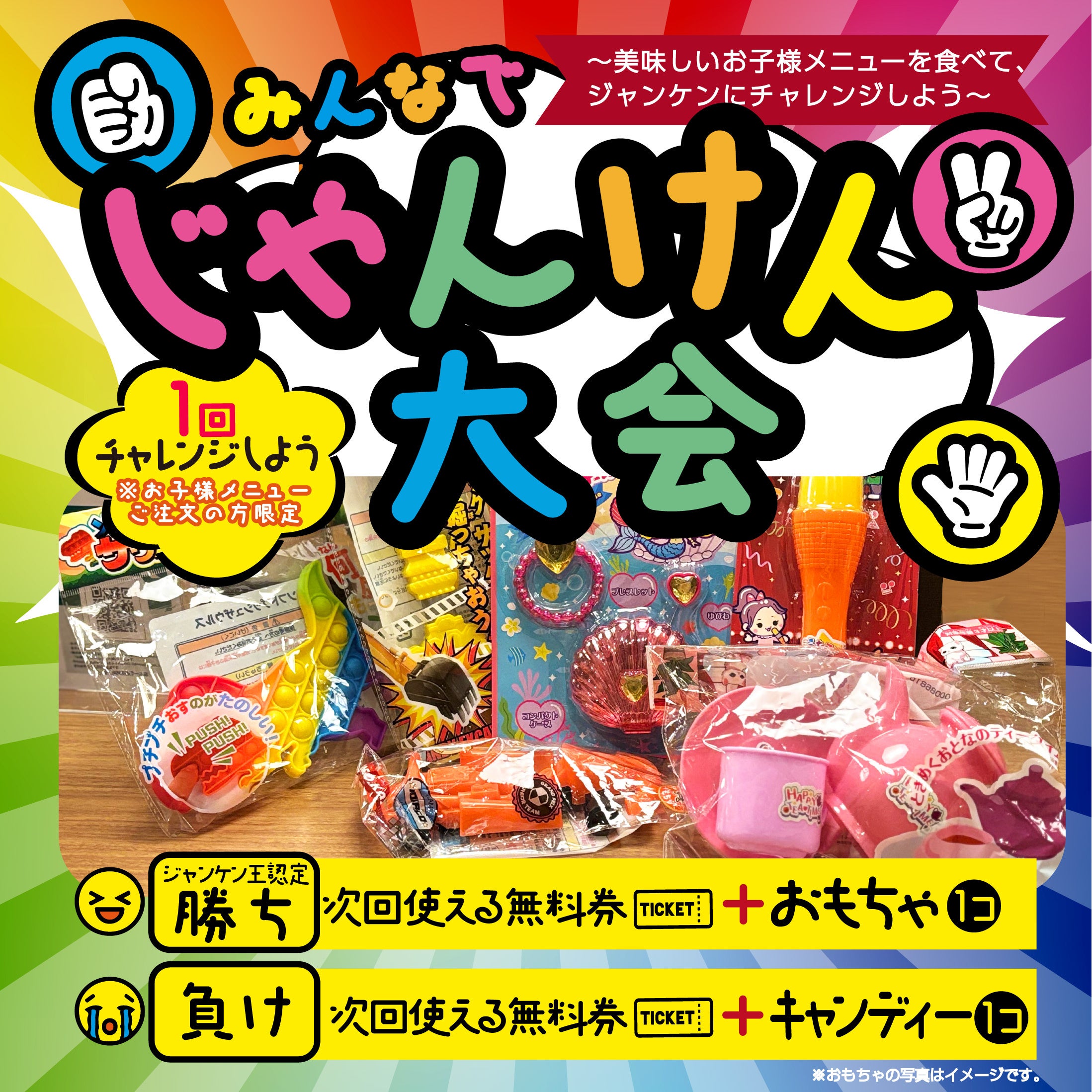 期間中、お子様メニューをご注文いただいたお子様は、店舗スタッフとの”じゃんけん大会”にご参加いただけます。勝ち・負けに応じて、異なる景品をプレゼントいたします。