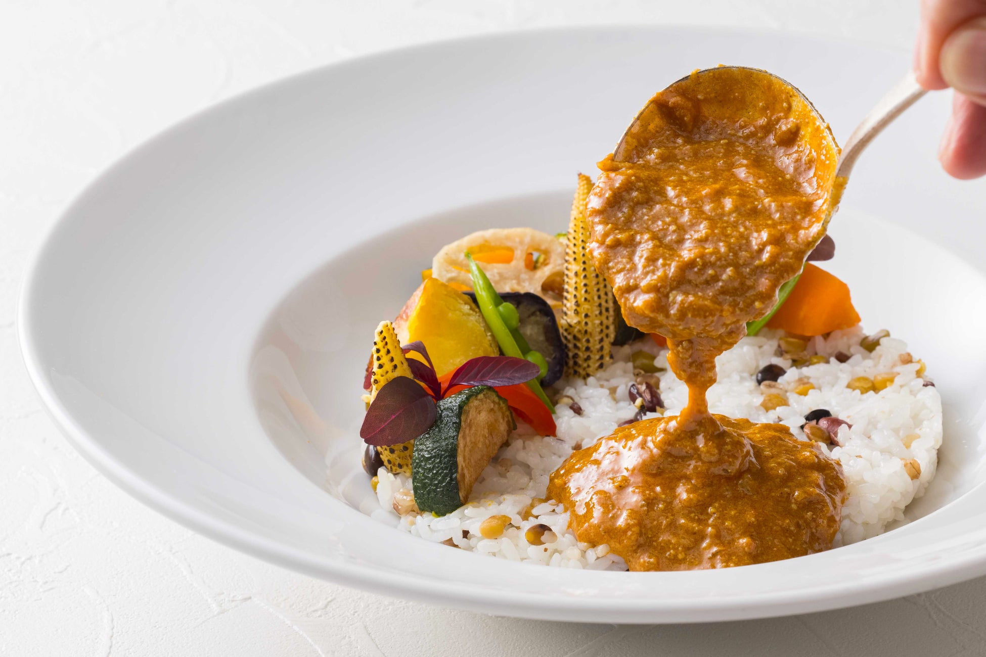 弱火で丁寧に引き出した野菜の旨みに、独自に配合したスパイスを重ね、香りが立つまでじっくりと炒めたルーが味わいの要に。さらに、鶏ガラから丹念に抽出したブイヨンを合わせ、辛みを抑えながらも奥行きのあるまろやかなスープに仕上げました。彩り豊かな夏野菜のグリルを添え、スパイスの余韻を引き立てる五穀米とともにご提供いたします。