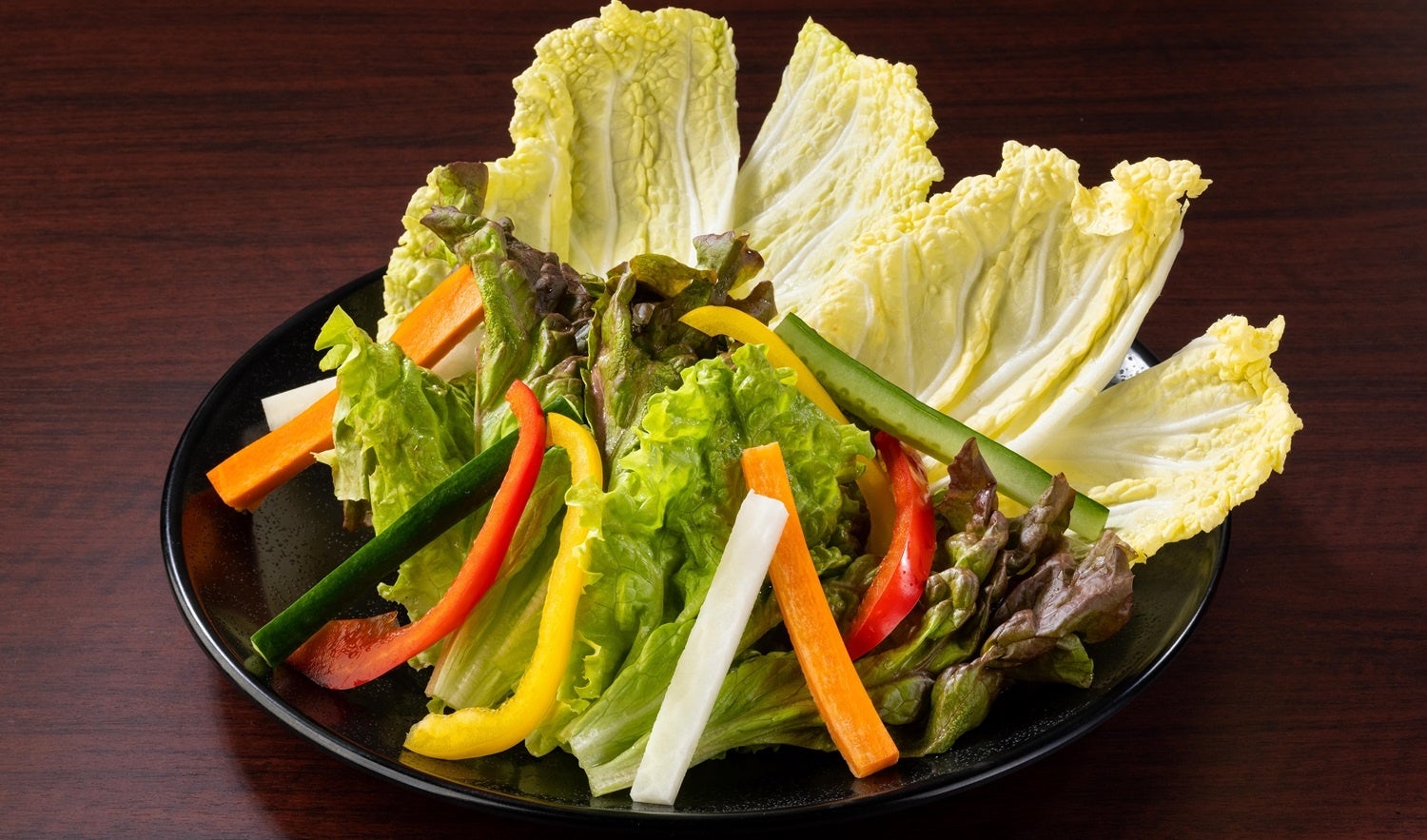 サニーレタスや白菜、人参、パプリカ、大根、キュウリを巻きやすい形にカットしてご用意いたしました。つけだれも合わせて、自分流の“巻き肉”をお楽しみください。