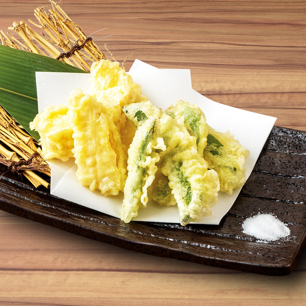 春の息吹をサクッと揚げた、季節を感じる天ぷら。ホクホクとした筍と、甘いスナップエンドウのコントラストが、春の喜びを告げる一品です