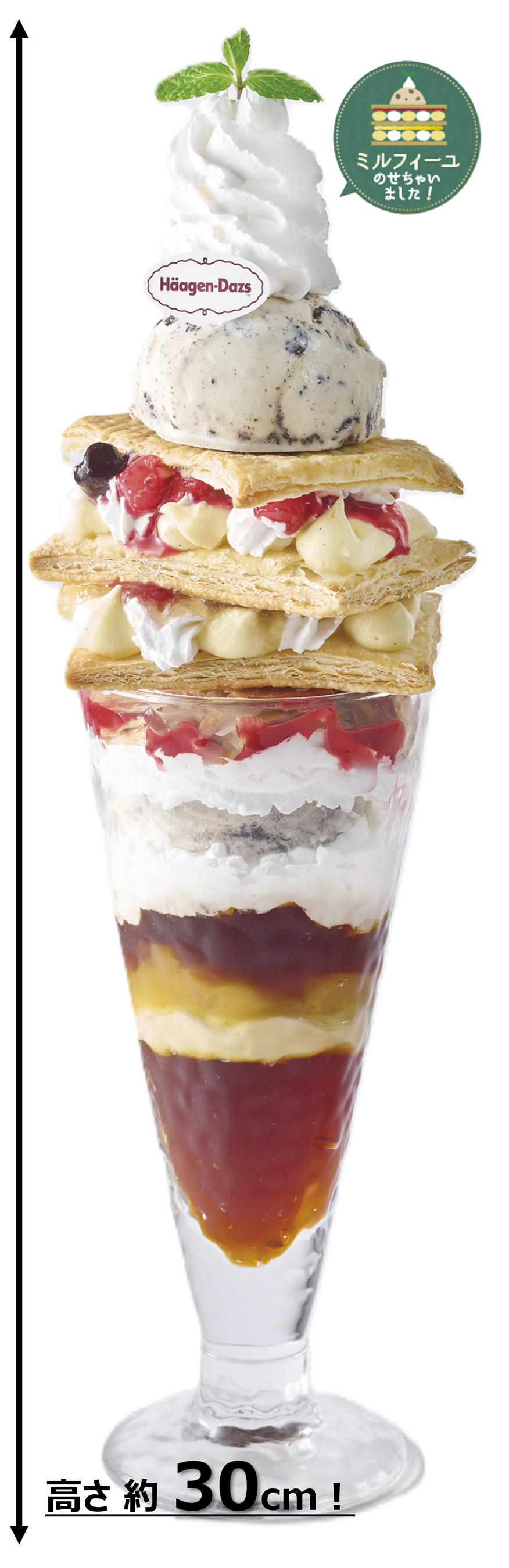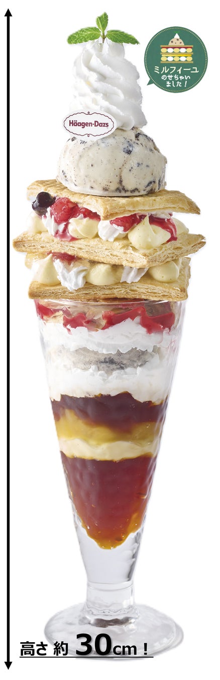 ハーゲンダッツの濃厚なクッキー&クリームアイスクリームとアールグレイゼリーが相性抜群のパフェ。アールグレイゼリーは紅茶の風味が際立つ甘さ控えめのゼリーです。高さ約30cmの中に、様々な食感や味わいを詰め込んだ、至福のご褒美パフェです。