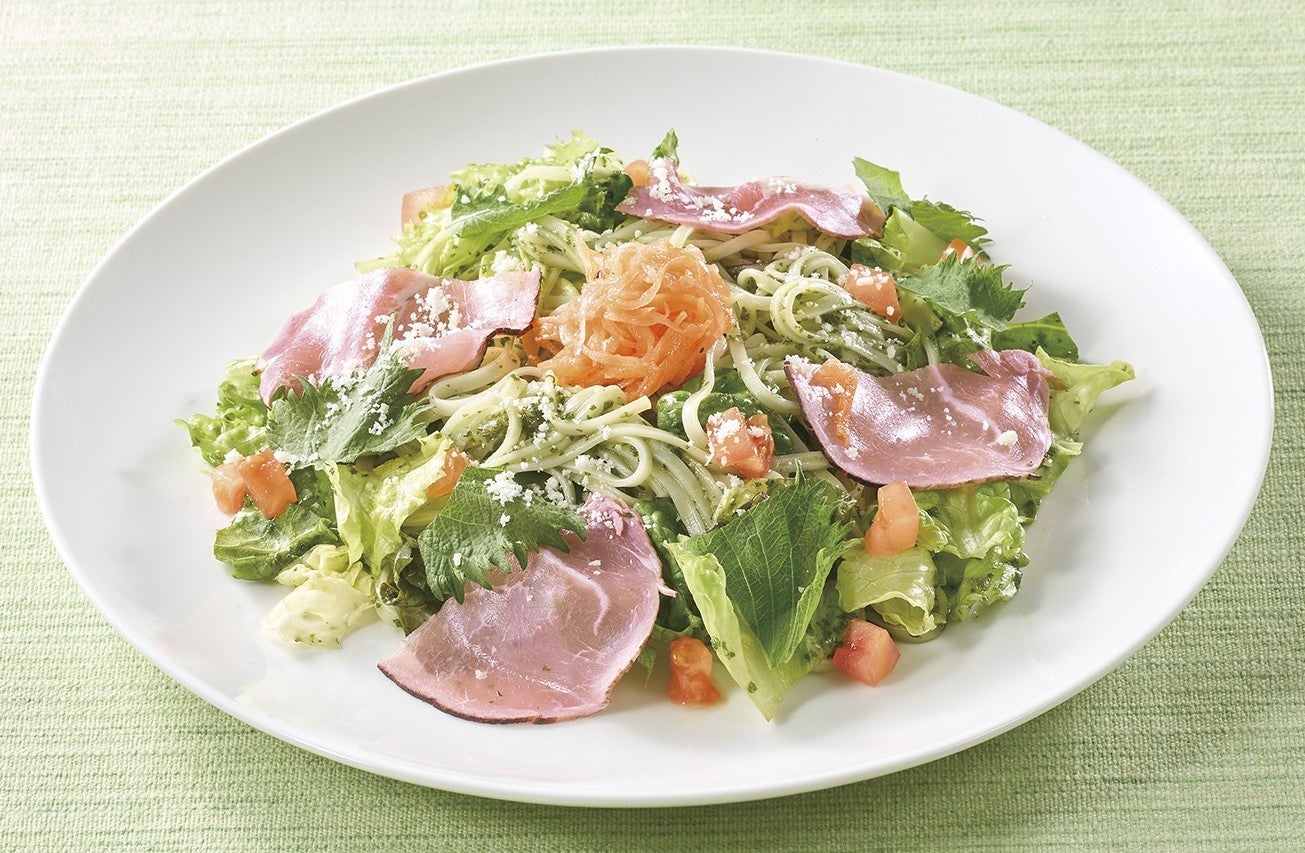 〈秋田無限堂 稲庭うどん〉炙り生ハムと大葉のジェノベーゼ風サラダうどん