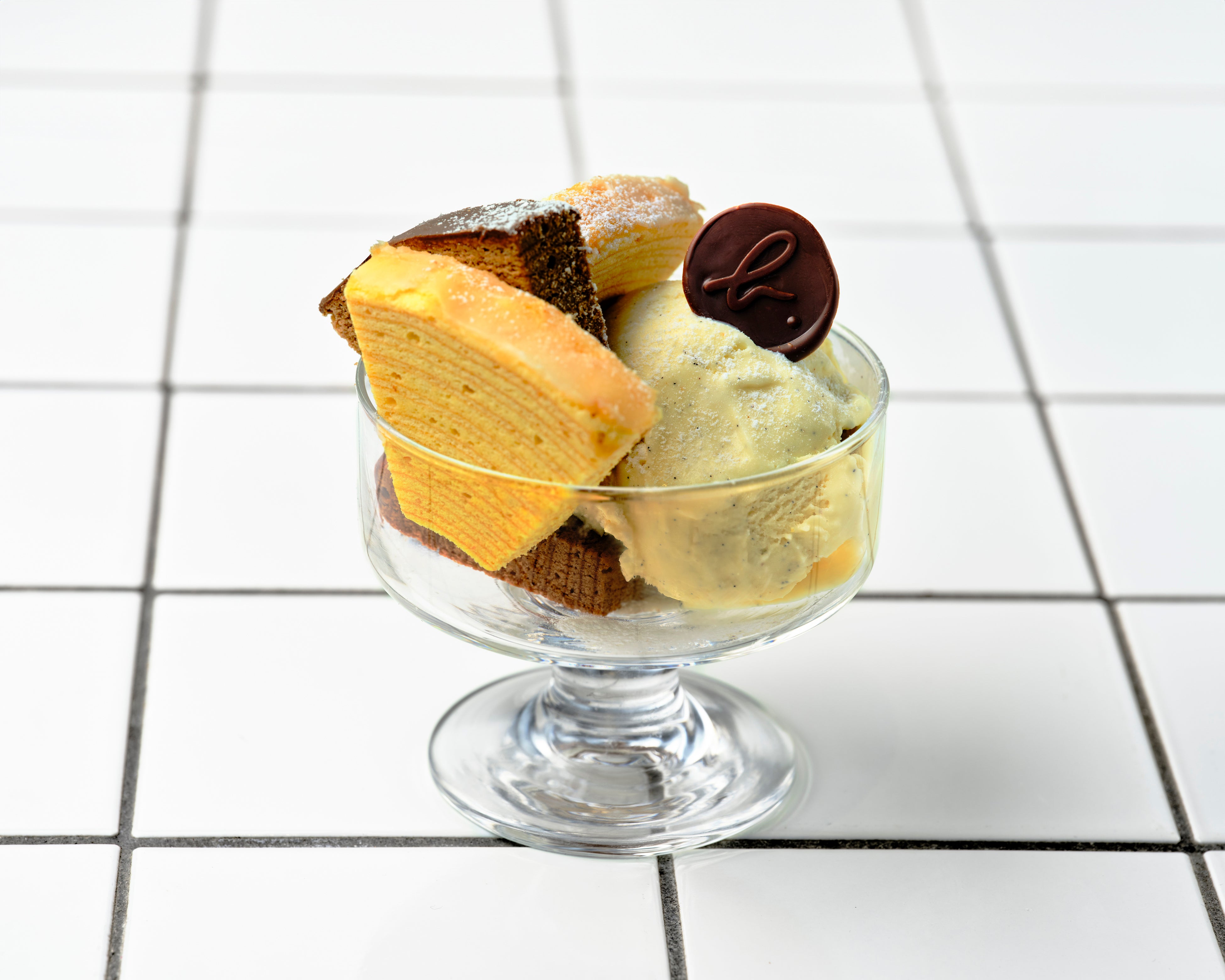 国産バターや卵、アーモンドパウダー、バニラビーンズを使用した、しっとりと風味豊かなユーハイムの人気バウムクーヘン。バターと卵の香りが広がるプレーンと、生地とコーティングで楽しむWチョコレートの2種に、バニラアイスクリームを添えた、アニエスベーならではの特別なデザートです。