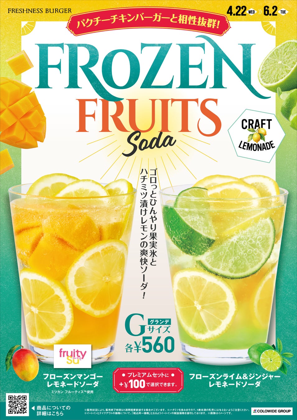コロワイドグループの株式会社フレッシュネス(代表取締役社長:齋藤 健太朗/本社:神奈川県横浜市西区)は、ハンバーガーチェーン「フレッシュネスバーガー」にて、2026年4月22日(水)より、氷を一切使わず、フルーツを凍らせた果実氷をゴロッと豪快に使用した「フローズンマンゴーレモネードソーダ」と「フローズンライム&ジンジャーレモネードソーダ」を期間限定発売いたします。