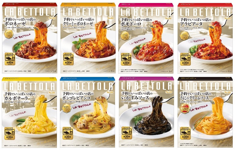 「予約でいっぱいの店」シリーズは、イタリアンの名店「ラ・ベットラ」の味わいと落合シェフの知恵を惜しむことなく詰め込んだパスタソースです。2026 年に発売 25 周年を迎えるにあたり、味わいのブラッシュアップとともに、白を基調とした華やかなパッケージに刷新しました。