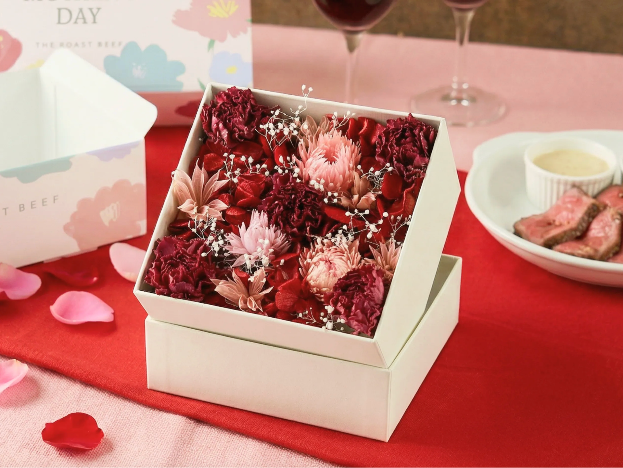 フラワーBOXは、プリザーブドフラワーならではの美しさが長く続き、そのまま飾れる手軽さと、空間にそっと彩りを添える存在感を兼ね備えています。「お肉だけでは少し寂しいかも」という贈り手の気持ちに寄り添い、食卓だけでなく空間全体を彩る存在として設計しました。