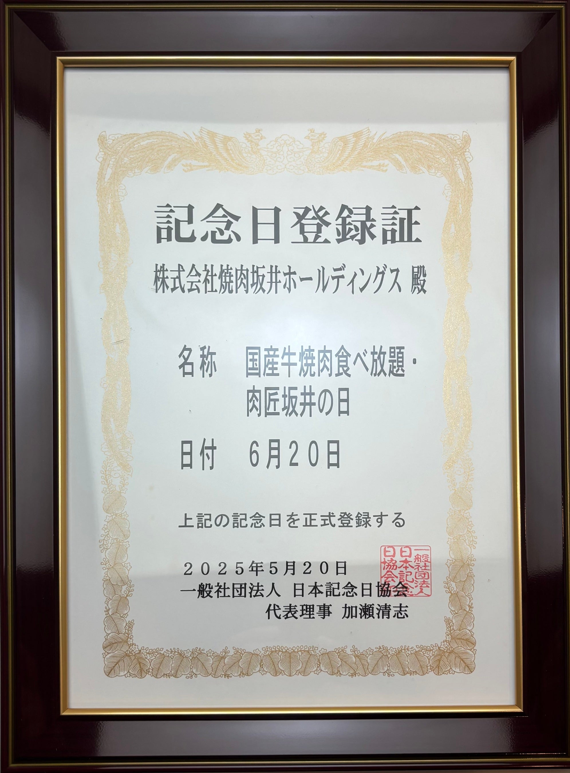 記念日名称:国産牛焼肉食べ放題・肉匠坂井の日 記念日日付:6月20日 正式登録日:2025年5月20日(火)