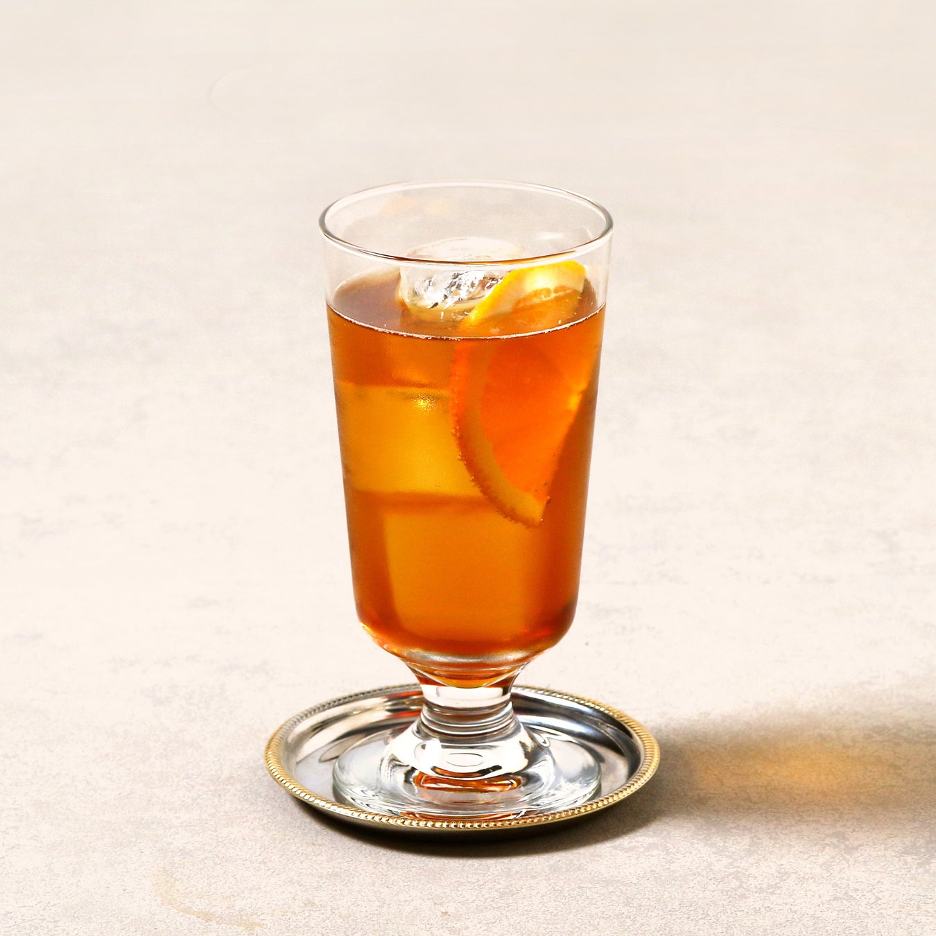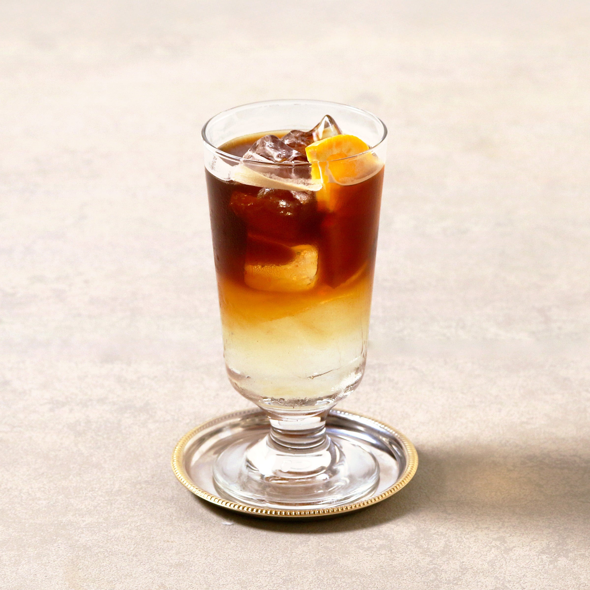 展覧会メインビジュアル《マドレーヌ》のテーブルの上に置かれた飲み物をイメージした、ノンアルコールのエスプレッソトニックです。オレンジを添えた爽やかな後味が特徴で、お食事にもよく合います。