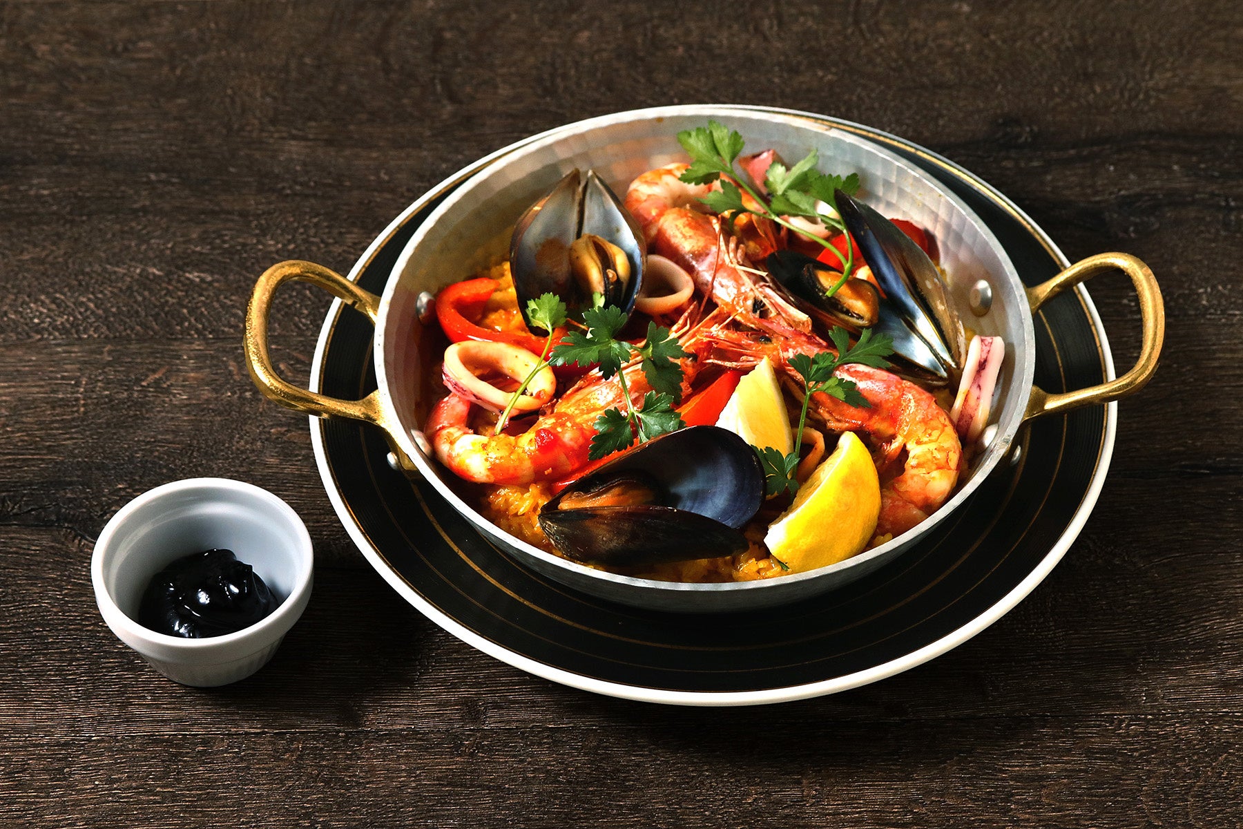 メインのパエリアは、19世紀末パリのモンマルトルにいくつも立っていた風車をイメージした盛り付けで、魚介の旨味が詰まった一品。別添えのイカスミソースで味の変化もお楽しみいただけます。